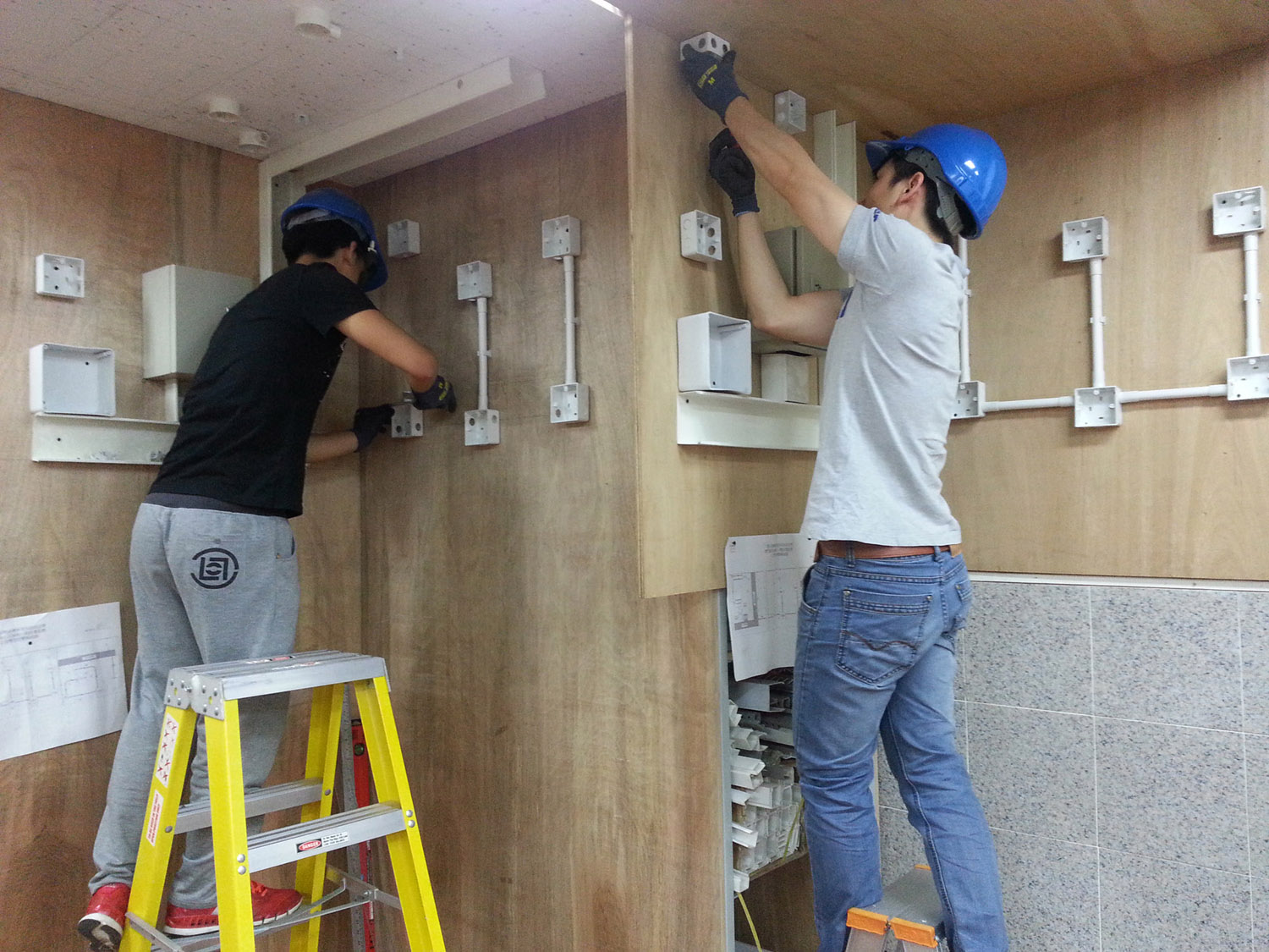 Formandos do “Curso de electricidade de instalações” na prática de instalações eléctricas