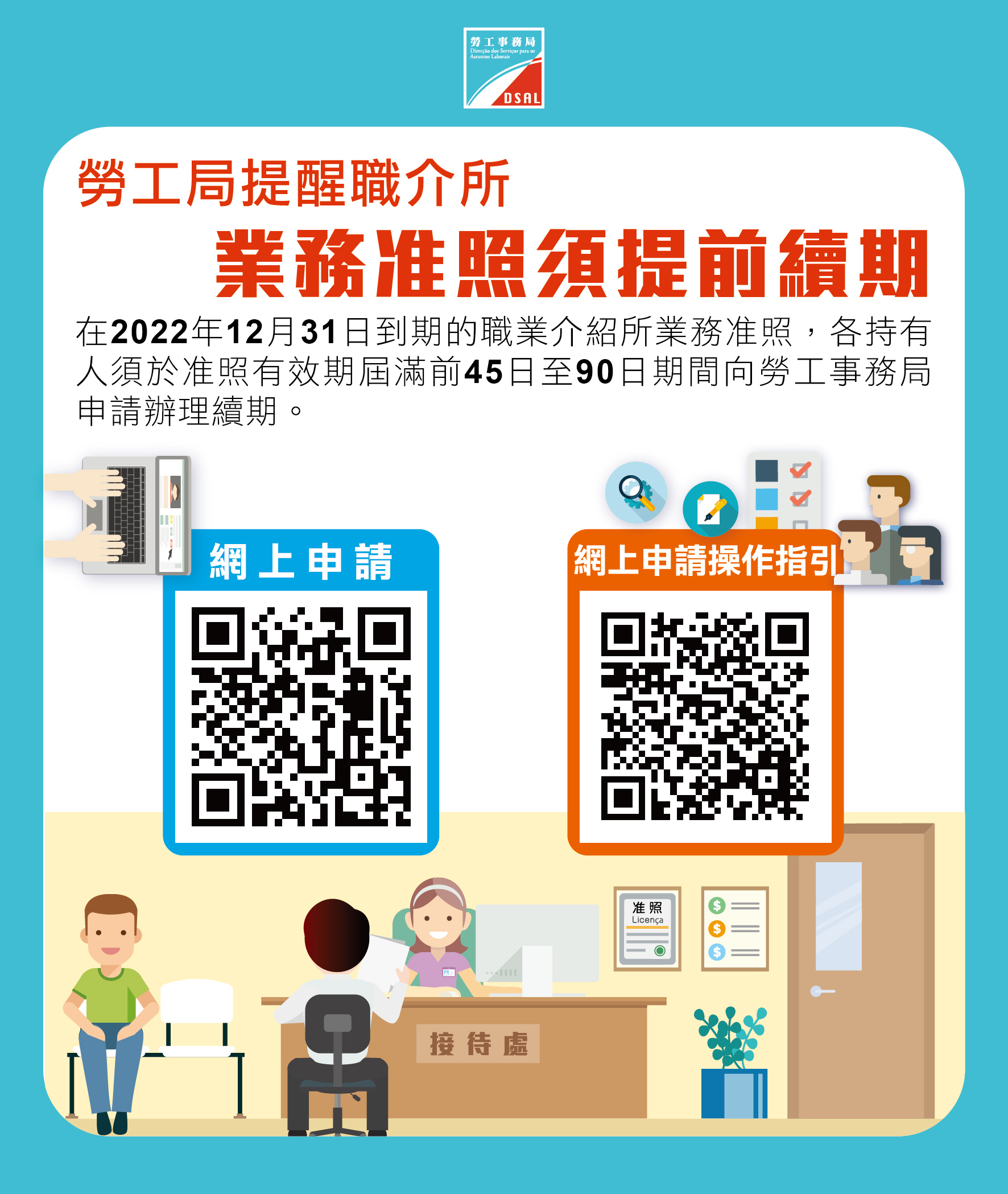 按照第16/2020号法律《职业介绍所业务法》规定,在2022年12月31日到期的职业介绍所业务准照,各持有人须於准照有效期届满前45日至90日期间向劳工事务局申请办理续期。倘少於45日前提出,须额外缴付多1倍续期费用;另倘有效期届满前仍未提出,准照会被注销。因此,准照持有人务必於法定期间内提出续期申请及提交所需的申请文件。办理续期可透过扫瞄二维码於网上申请或以纸本方式提出申请。