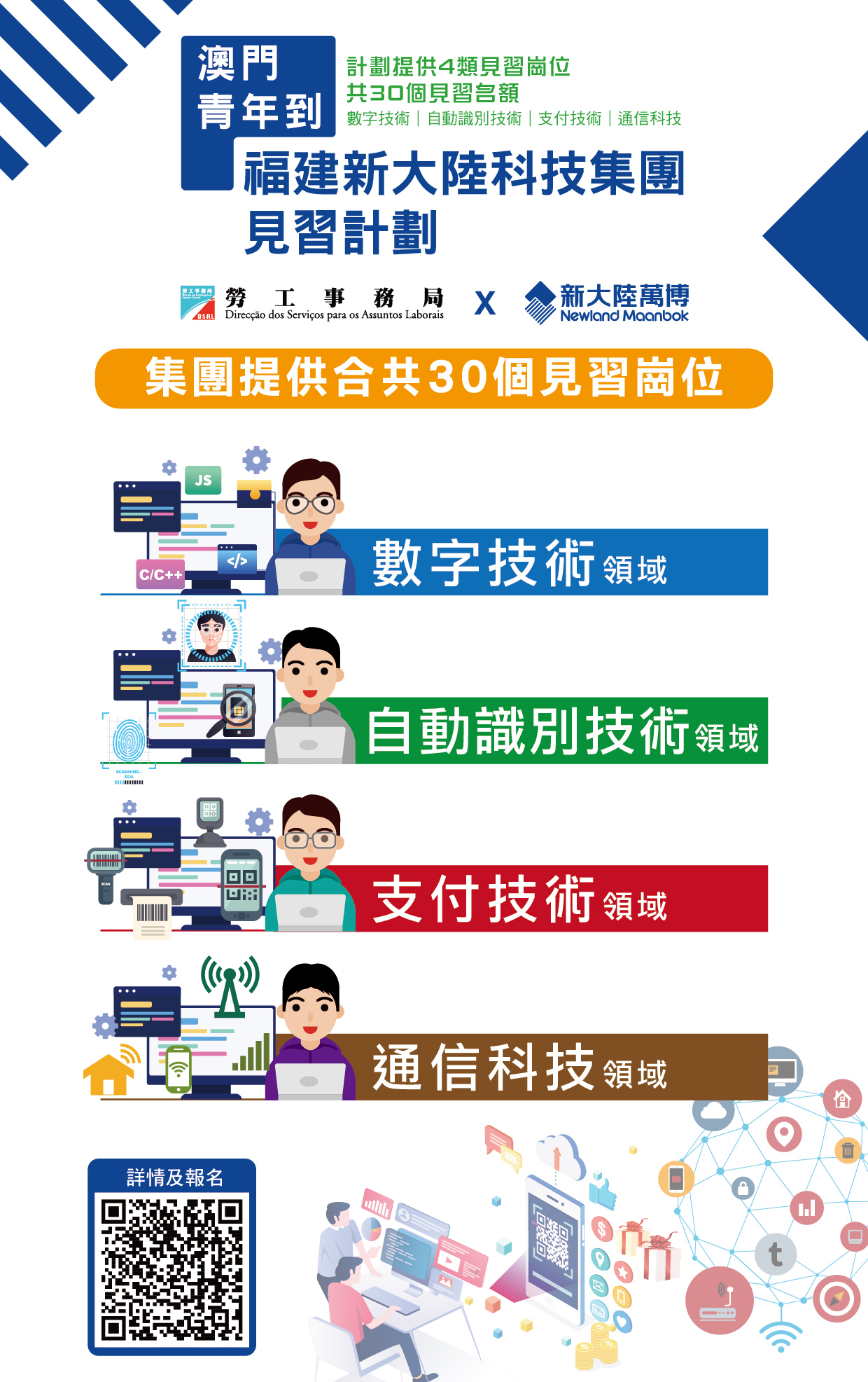 计划为期3个月,见习地点位於福建省福州市,岗位涵盖数字技术、自动识别技术、支付技术及通信科技等领域,分别由集团旗下四家企业提供合共30个见习岗位。新大陆科技集团长期从事科技创新和创新成果市场转化的高科技企业,産品和服务已覆盖全球上百个国家和地区。见习活动由企业派资深业务代表以在岗带教模式进行,有志投身高新科技行业发展的青年朋友,勿失良机。