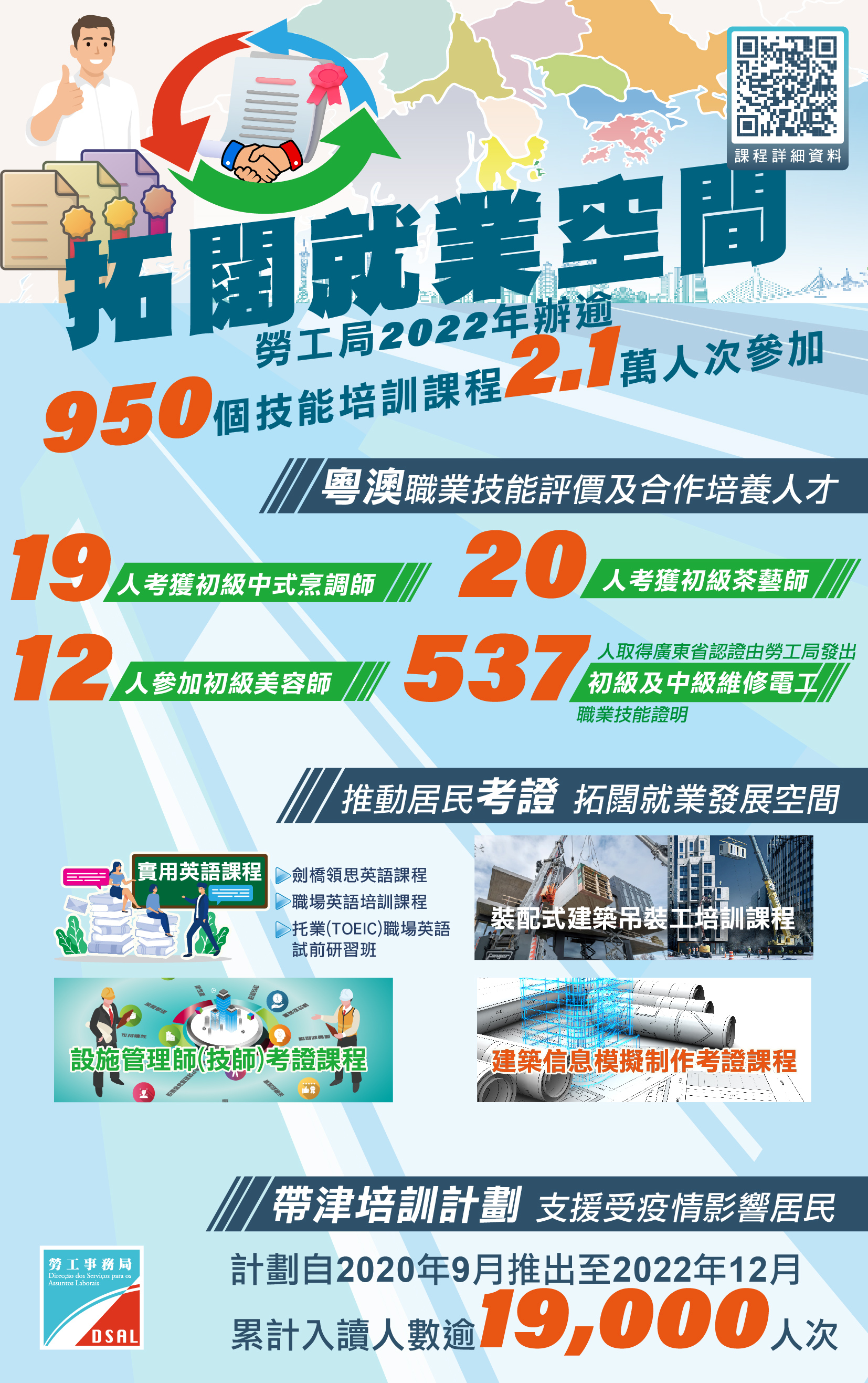 劳工事务局一直重视人才培养,透过与社会伙伴及邻近地区的紧密合作,开办多元职业培训课程及技能测试项目,提升人员的技能水平,并为澳门经济发展所需的各类应用人才提供支撑。於2022年,劳工事务局开办了逾950个职业培训课程,参加培训学员逾21,000人次。