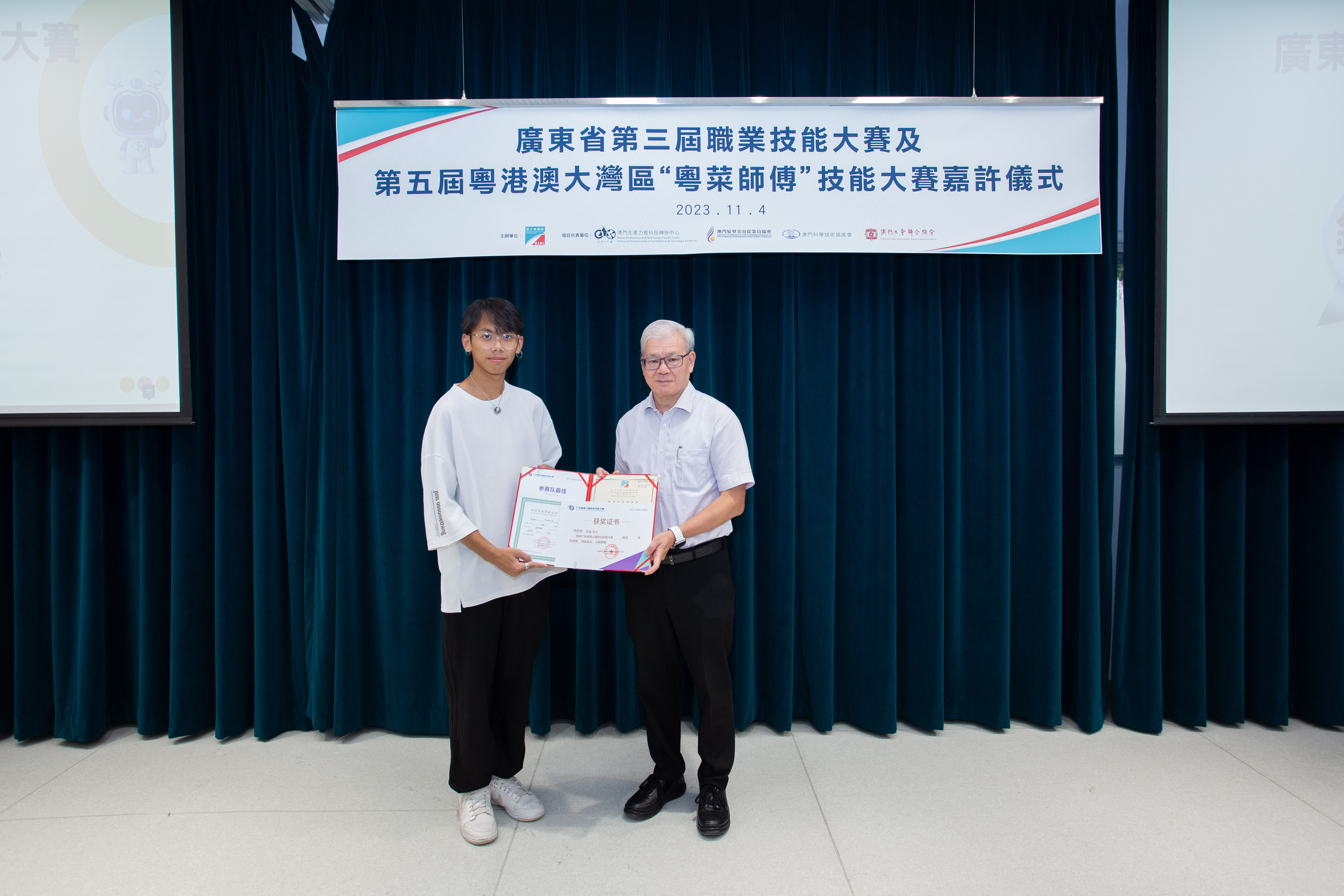 为加强粤澳两地业界的交流和合作,推动行业发展及技能传承,劳工局於本年3月邀请本澳业界团体协助组织业界代表,派出5名选手参加於梅州市举行的粤港澳大湾区"粤菜师傅″技能大赛粤菜名厨组比赛,其中本澳代表余天俊获得中式烹调师三等奖及预制菜优胜奖,吴冠毅及赵加卫则分别获中式烹调师及中式面点师的预制菜优胜奖。5名参赛选手均达竞赛规定,获发内地认可技师级别的职业技能等级证书及劳工局发出的职业技能证明。