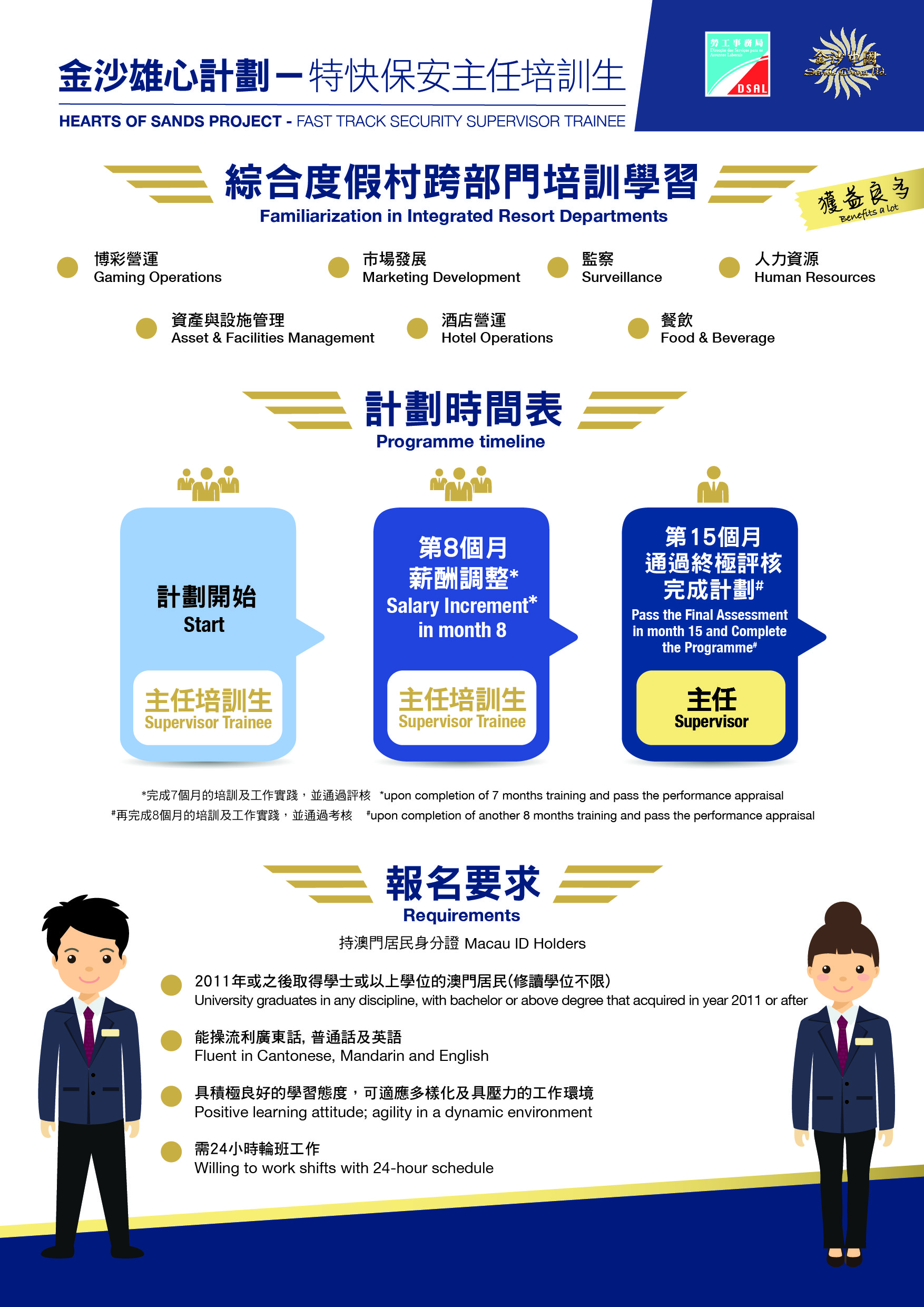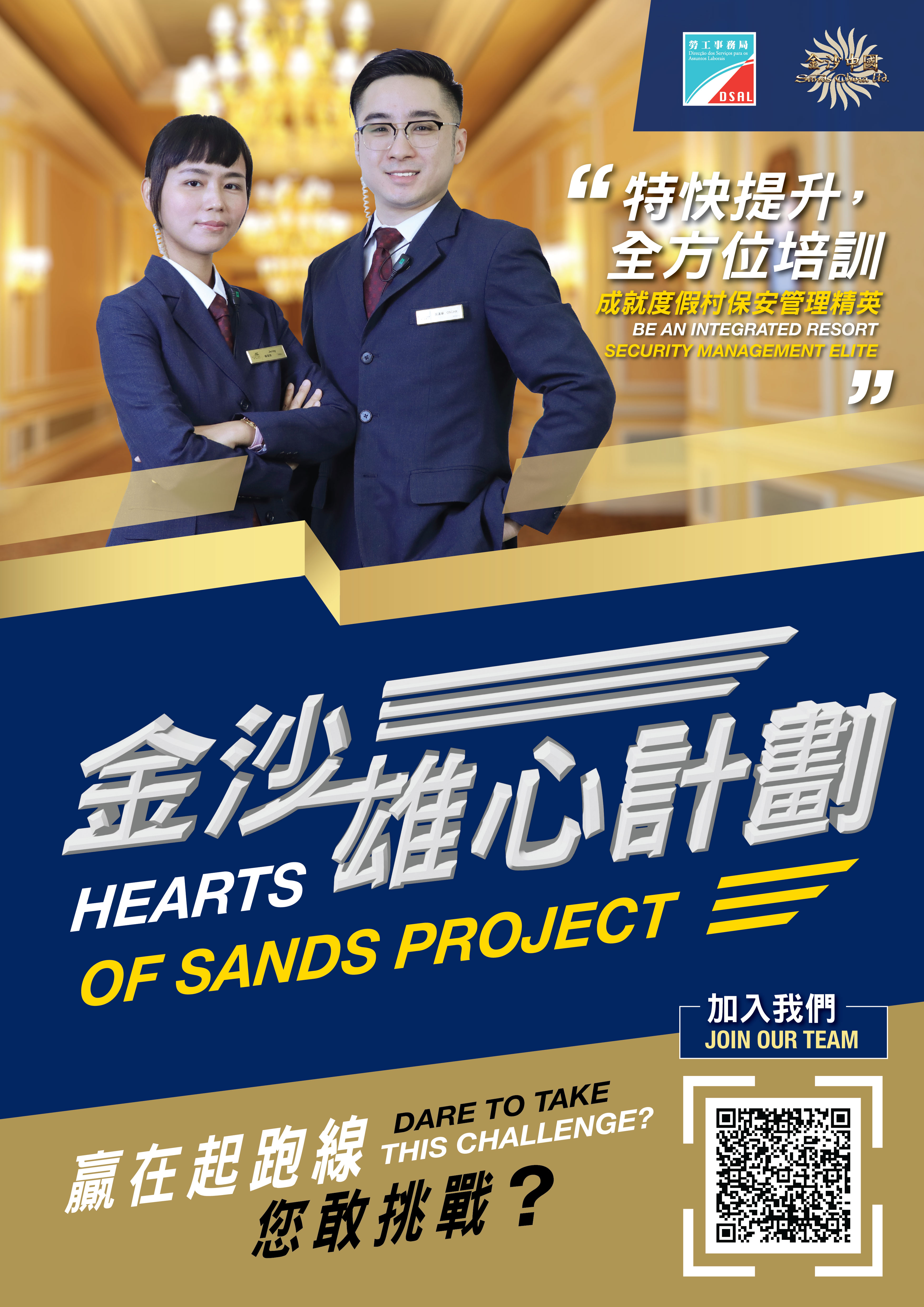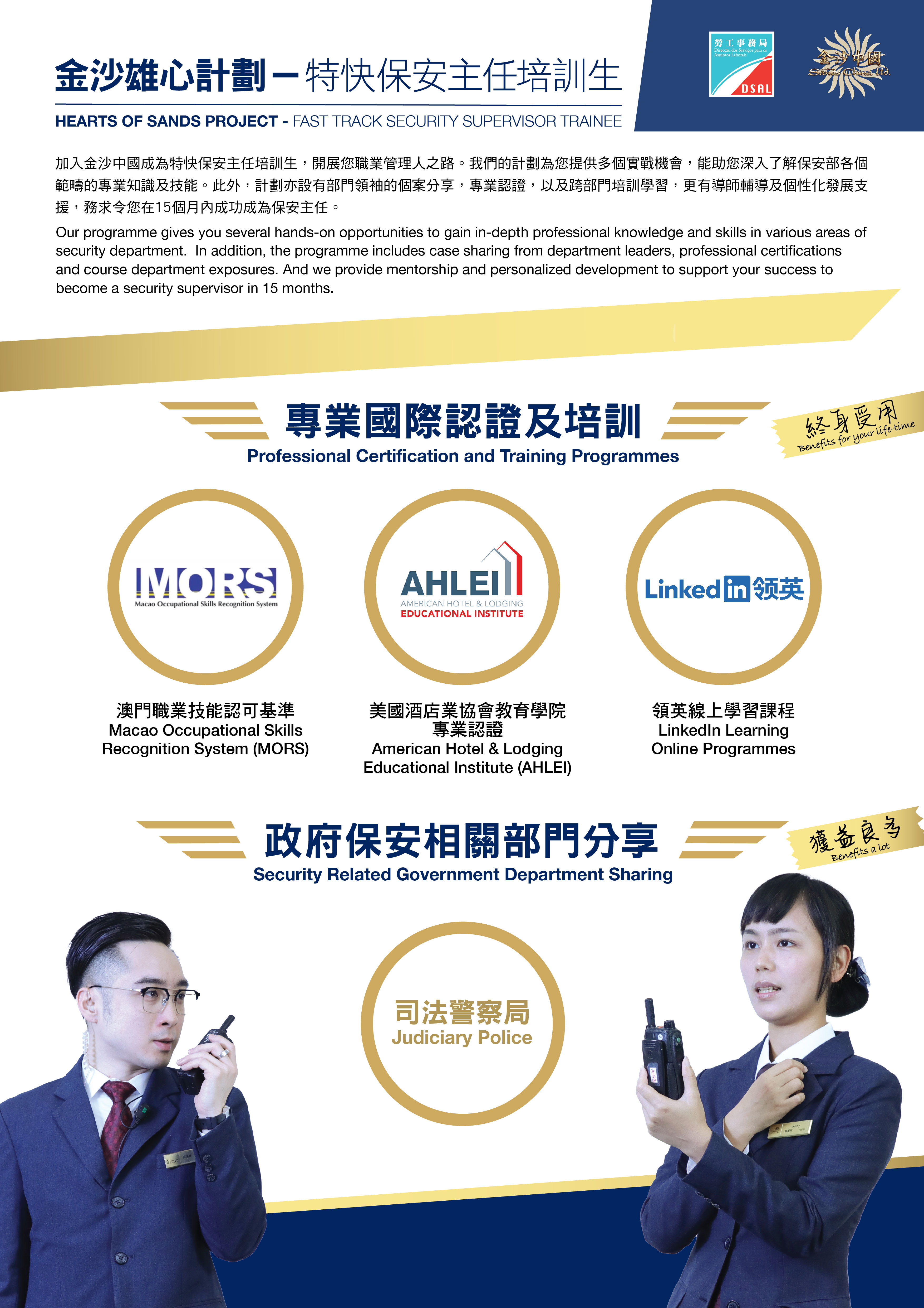 为支持本地人才全面发展,拓展多元职涯路向,劳工事务局和金沙中国有限公司(下称“金沙中国")合作推出「金沙雄心计划—特快保安主任培训生」,以“先入职、后培训”方式,为有志投身综合旅游休閒服务行业的澳门居民提供全方位培训及事业发展机会,计划由5月21日起接受申请。