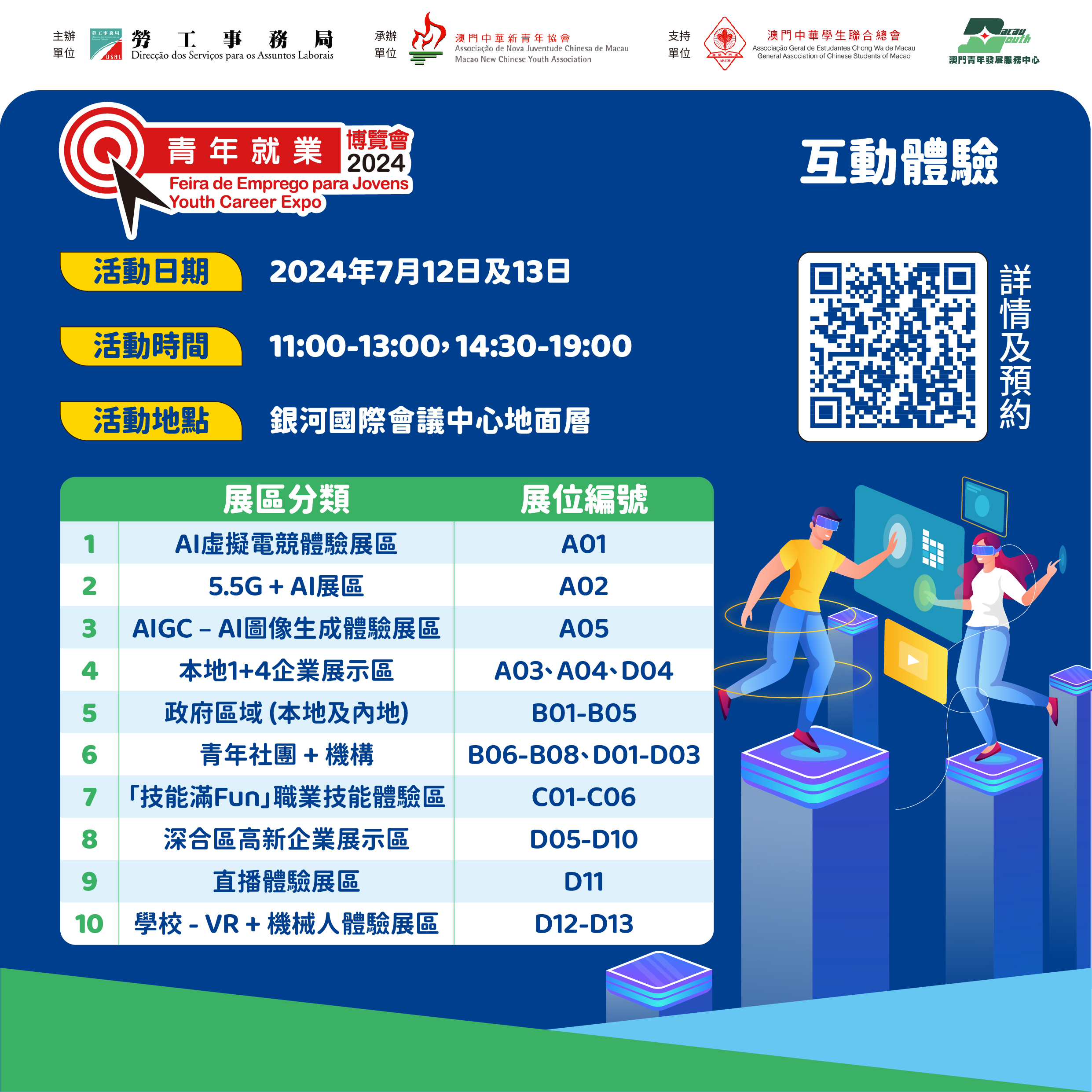“青年就业博览会 2024”由劳工事务局主办,澳门中华新青年协会承办并由澳门中华学生联合总会及澳门青年发展服务中心支持,定於7月12日至13日假银河国际会议中心举行。今年主题为“展・未来新视界、探・就业新动向”,活动内容丰富,博览会期间场馆内设多项活动,包括有论坛、“1+4”行业讲座、互动体验展区等服务,明(2日)起网上接受预约进场。