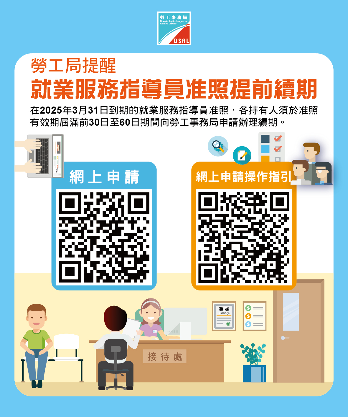 按照第16/2020号法律《职业介绍所业务法》规定,在2025年3月31日到期的就业服务指导员准照,各持有人须於准照有效期届满前30日至60日期间(即於2025年1月31日起)向劳工事务局申请办理续期。倘少於30日前提出,须额外缴付多1倍续期费用;另倘有效期届满前仍未提出,准照会被注销。因此,准照持有人务必於法定期间内提出续期申请及提交所需的申请文件。办理续期可透过扫瞄二维码於网上申请或以纸本方式提交。