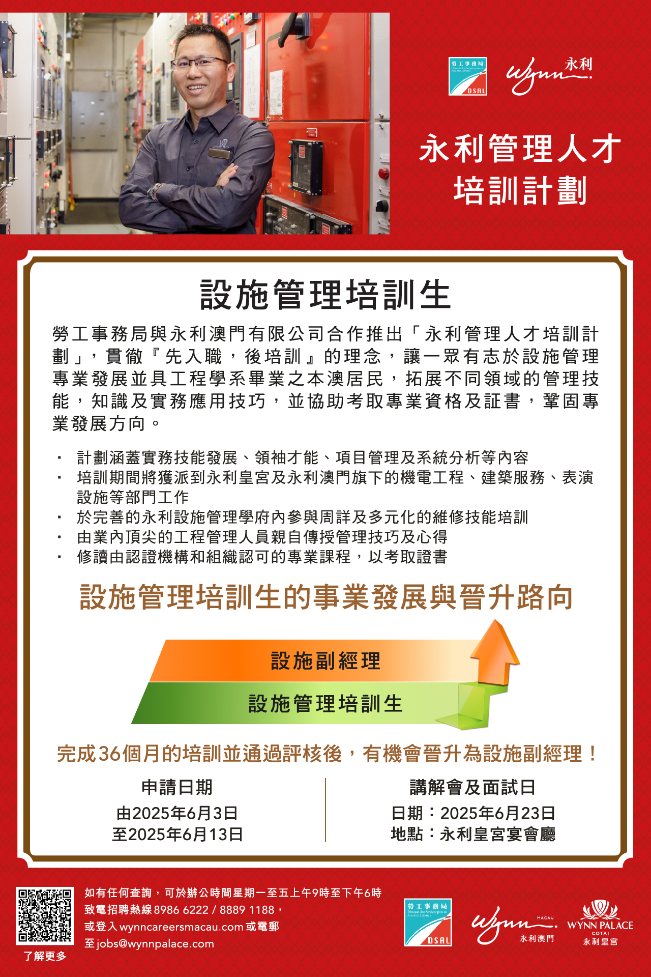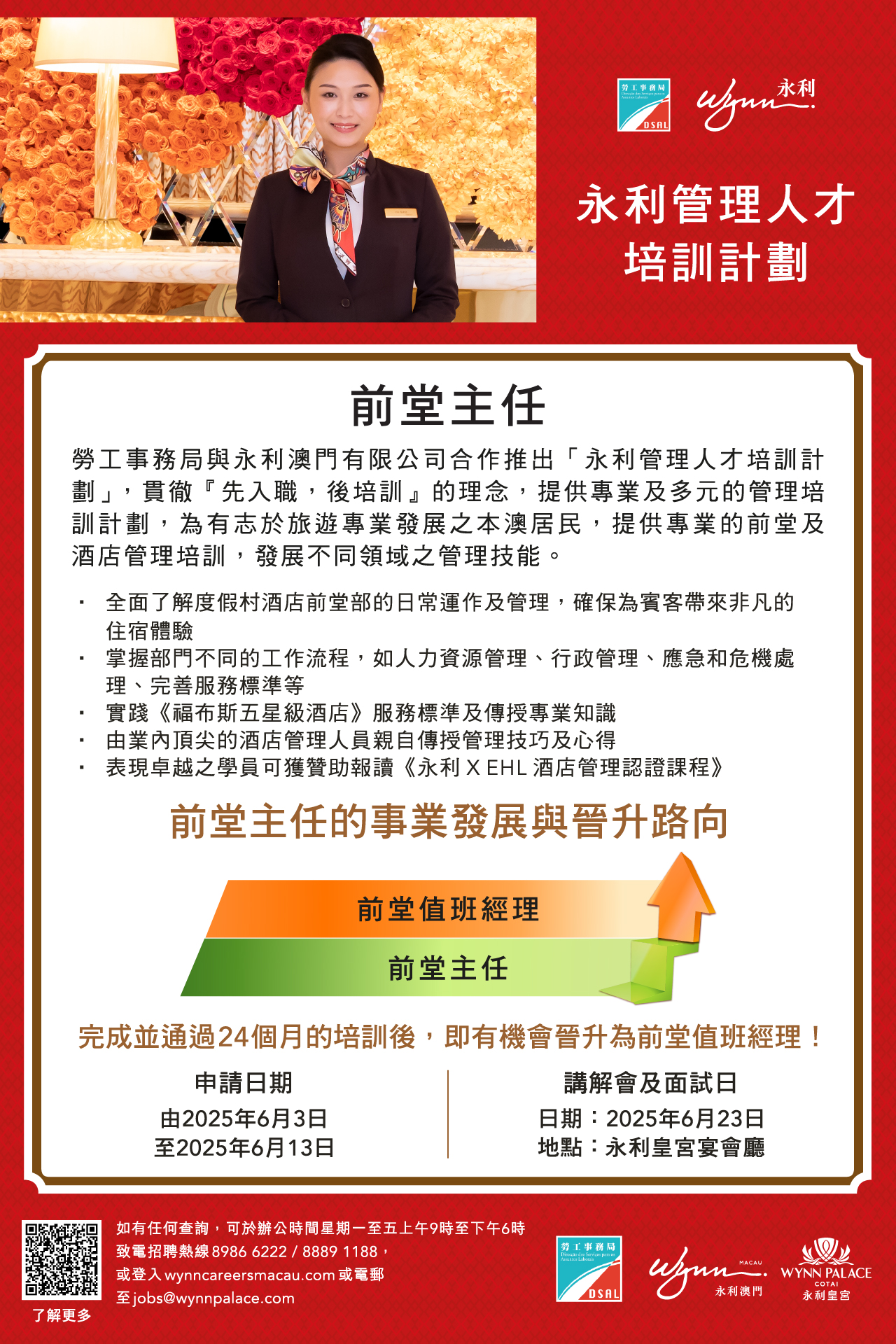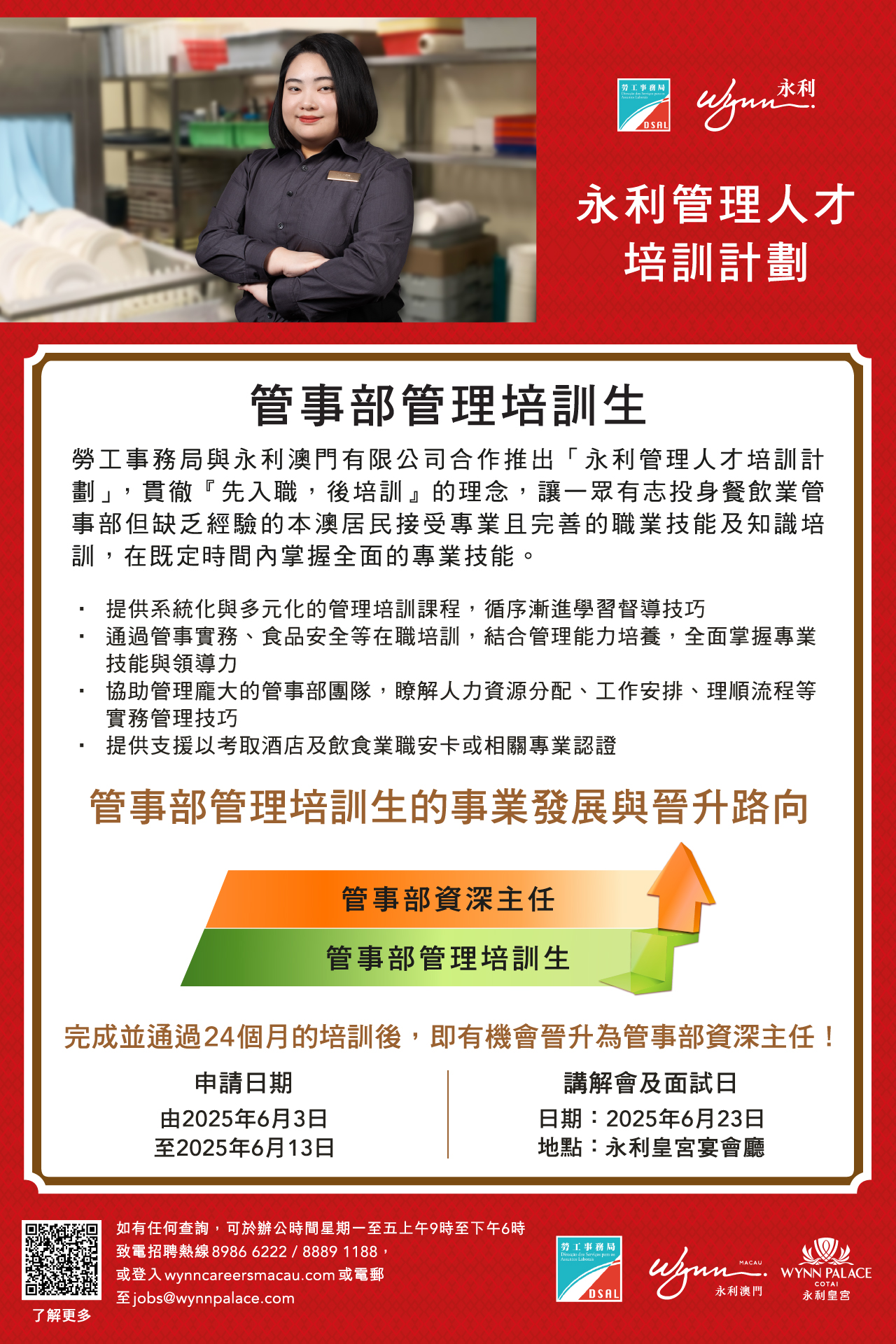 为支持本地人才全面发展,拓展多元职涯路向,劳工事务局(下称劳工局)和永利澳门有限公司(下称永利)合作推出“永利管理人才培训计划"(下称计划),以“先入职、后培训"方式,为有志投身酒店服务及设施管理範畴的澳门居民,提供全方位的培训及事业发展机会,计划由6月3日起接受申请。