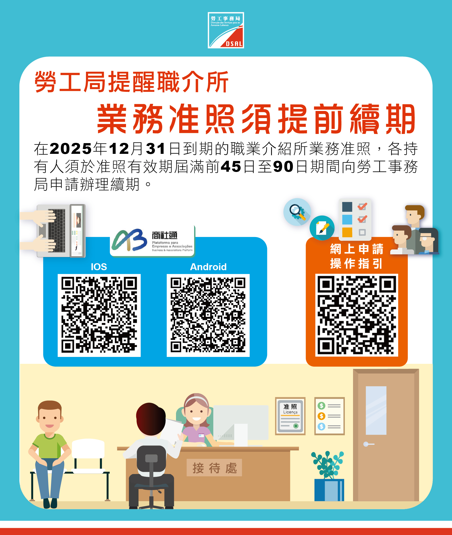 按照第16/2020号法律《职业介绍所业务法》规定,在2025年12月31日到期的职业介绍所业务准照,各持有人须於准照有效期届满前45日至90日期间(即2025年10月3日起)向劳工事务局申请办理续期。倘少於45日前提出,须额外缴付多1倍续期费用;另倘有效期届满前仍未提出,准照会被注销。因此,准照持有人务必於法定期间内提出续期申请及提交所需的申请文件。续期方式可扫瞄二维码下载商社通手机应用程式网上提交或以纸本提出申请。