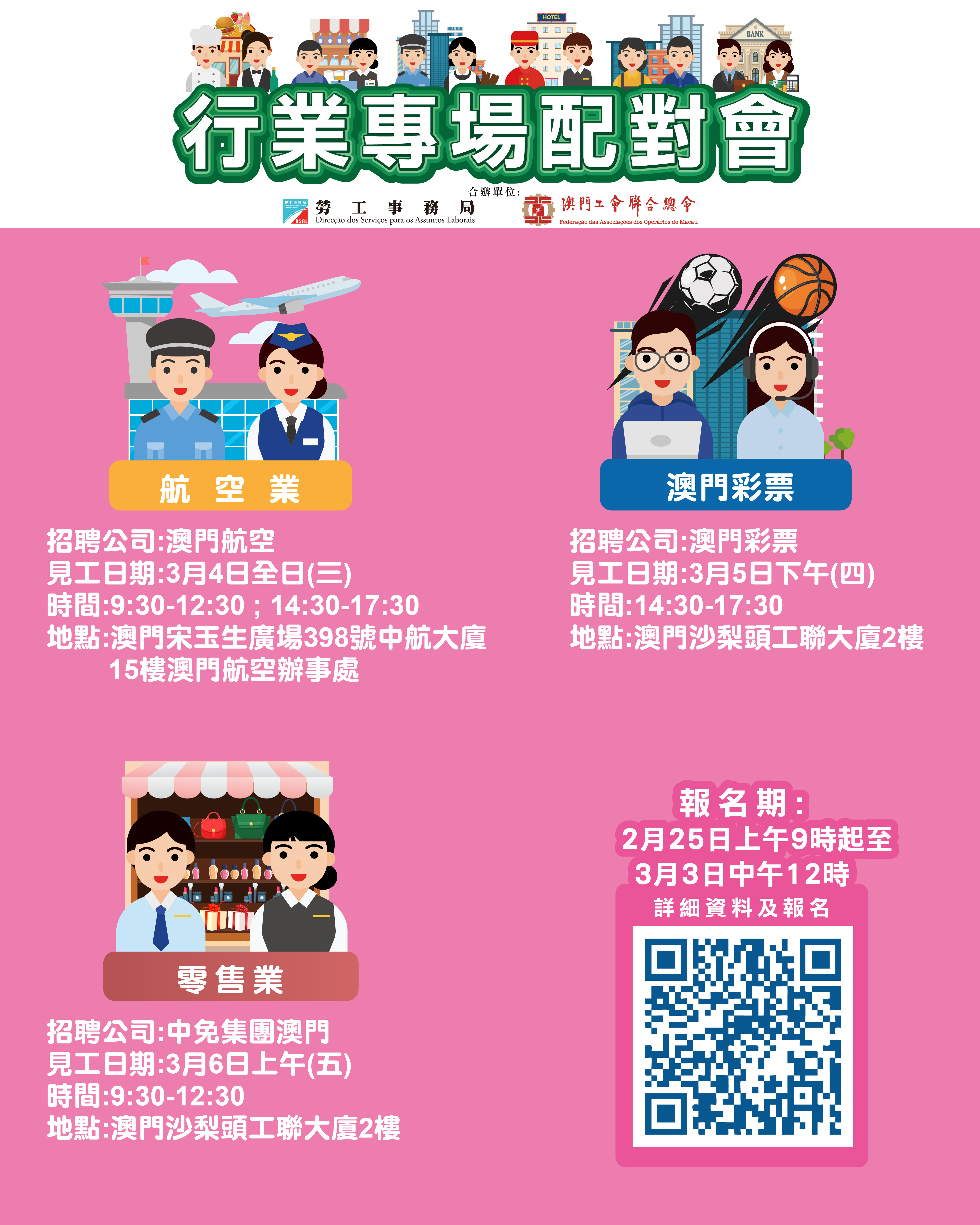 3月4日上午及下午的航空业专场配对会将於澳门宋玉生广场398号中航大厦15楼澳门航空办事处举行;3月5日下午澳门彩票有限公司专场配对会及3月6日上午零售业专场配对会均在澳门沙梨头海边街2-6号工联大厦二楼举行。报名日期由即(25)日上午9时起至3月3日中午12时。