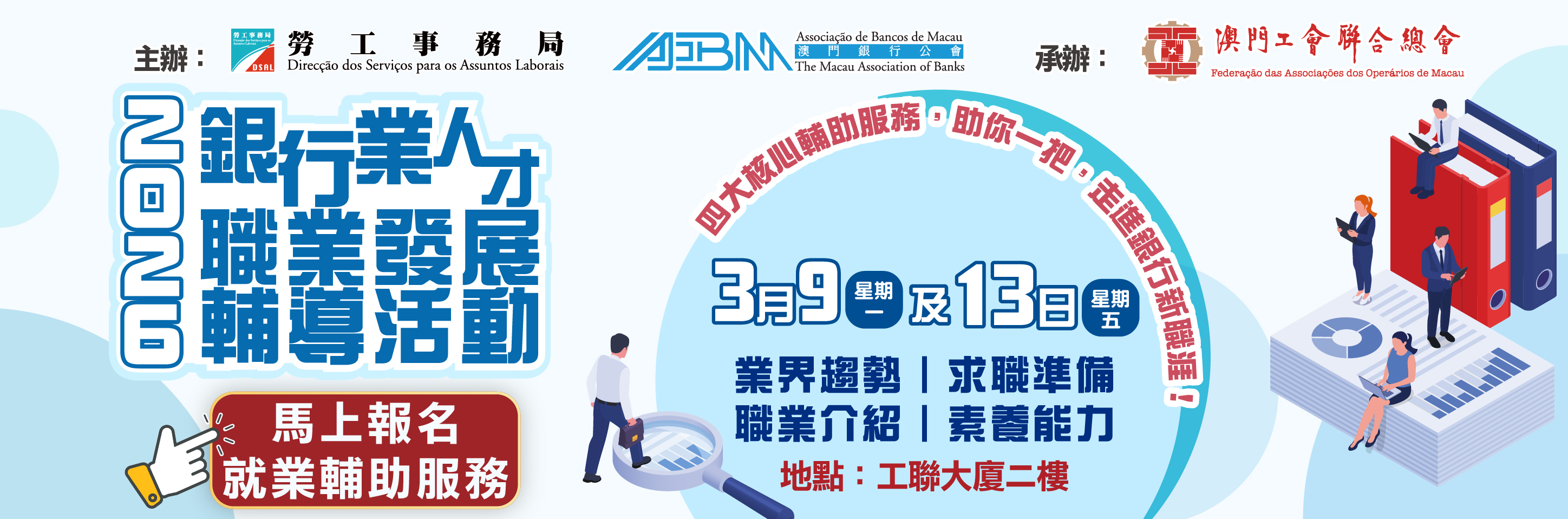 为配合特区政府推动经济适度多元与提升本地人才竞争力,由劳工事务局(下称“劳工局”)和澳门银行公会合办、澳门工会联合总会(下称“工联”)承办的“2026年银行业专场职业配对会”,将於2026年3月26日及27日一连两日假澳门旅游塔会展娱乐中心三楼举行。