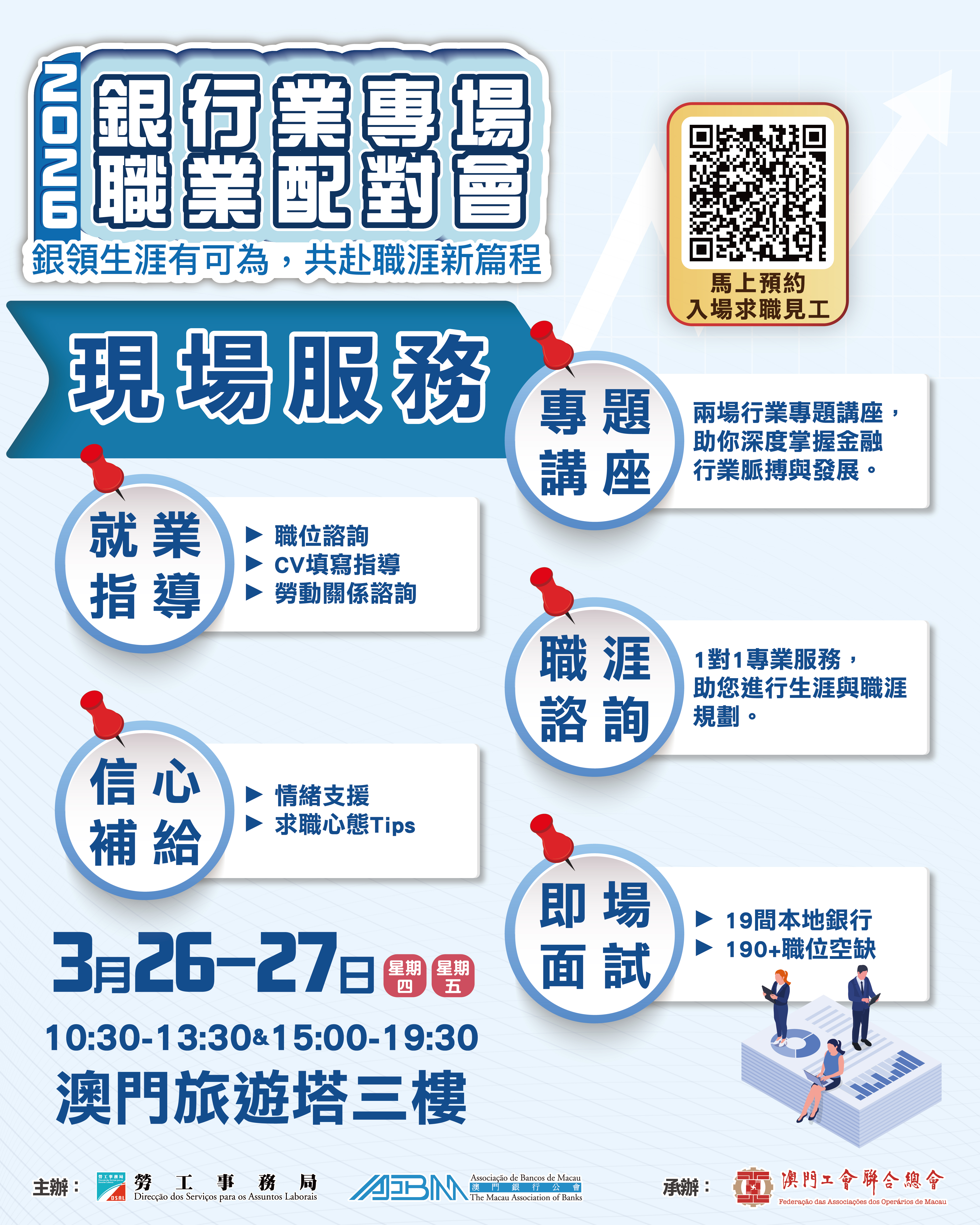 为协助有意投身银行业的本澳居民提供就业机会,培育及发掘本地银行业人才,由劳工事务局(下称“劳工局”)和澳门银行公会合办、澳门工会联合总会承办的“2026年银行业专场职业配对会”,将於3月26日至27日一连两日假澳门旅游塔会展娱乐中心三楼举行,现场提供逾190个职位空缺,有意投身银行业的澳门居民可由即日起至3月24日期间进行网上预约登记。