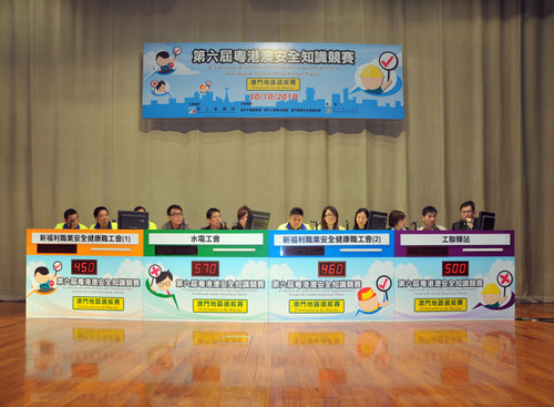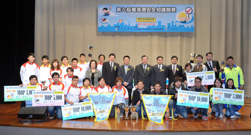 由澳门劳工事务局、广东省安全生产监督管理局以及香港职业安全健康局合办的「第六届粤港澳安全知识竞赛」将於2011年在澳门举行。竞赛的目的是透过职安健问答比赛,让在职人士加强认识和掌握有关职业安全与健康的知识,以预防工作意外和职业病的发生。 为了选出澳门地区的代表参加明年的总决赛,劳工事务局已於上月底,假澳门理工学院大礼堂举办「第六届粤港澳安全知识竞赛」澳门地区选拔赛。比赛设工会组及企业组两个组别,每组以队制形式,派出三名代表出赛,透过对有关职安健知识的实物操作题、影片题和问答题进行竞赛,最后以每组比赛积分最高的一队为优胜队伍。 是次竞赛内容涉及各行各业及多种工种的职安健知识,包括:粤港澳三地的职安健法规知识,以及十四项主要的职业安全健康知识,如建造业安全、饮食业安全、办公室安全、安全管理、工场整理、体力处理操作、职业健康、消防安全、电力安全、化学品安全、烧焊操作安全、机械操作安全及个人防护等。 是次比赛由劳工事务局孙家雄局长、陈景良副局长、职业安全健康厅林玉章厅长、澳门中华总商会黄树森副理事长、澳门工会联合总会郑仲锡副理事长以及澳门职业安全健康协会萧志泳会长担任比赛的名誉评判及颁奖嘉宾。 是次比赛结果为: 工会组 冠军 :水电工会 亚军 :工联驿站 季军 :新福利职业安全健康职工会 (2队) 企业组 冠军 :澳门电力股份有限公司 (2队) 亚军 :澳门电力股份有限公司 (3队) 季军 :澳门电力股份有限公司 (1队) 工会组和企业组比赛的冠、亚、季军队伍,分别获颁发澳门币壹万元、伍仟元及叁仟元的奖金,以及获颁发奖盃。两组优胜队伍将代表澳门参加於2011年在本澳举行的「第六届粤港澳安全知识竞赛」,与广东省及香港特别行政区的代表队伍进行职安健知识的竞赛和交流。