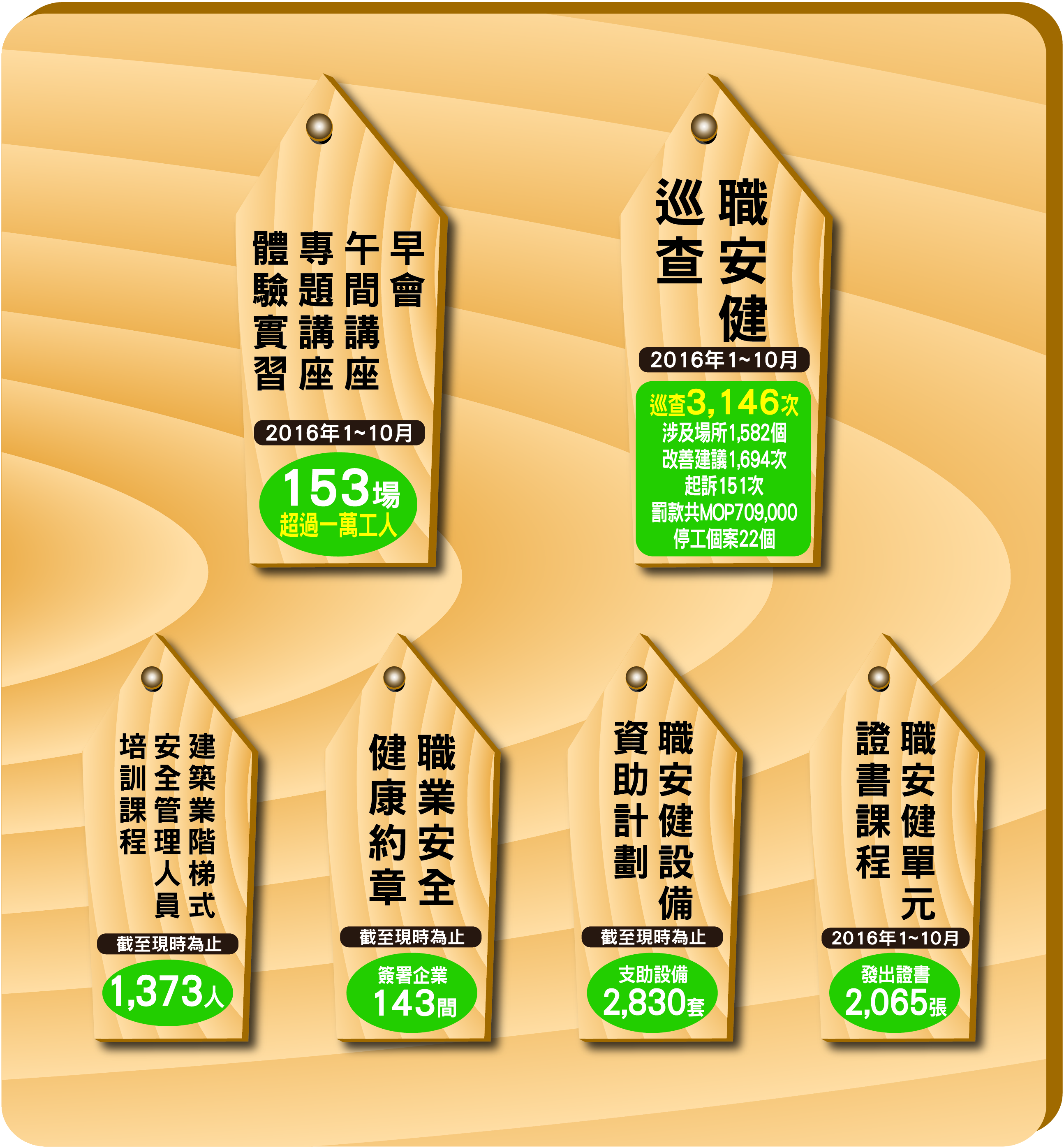 情况!劳工局喺2016年1至10月,一共巡查咗3,146次,其中涉及1,582个企业场所,同提出改善建议1,694次。而对违规个案就起诉咗151次、罚咗MOP709,000以及22个停工个案。政府对监督同促进职业安全责无旁贷,所以会不时检讨同改善巡查机制,同唔同部门、团体合作,预防工作意外发生。