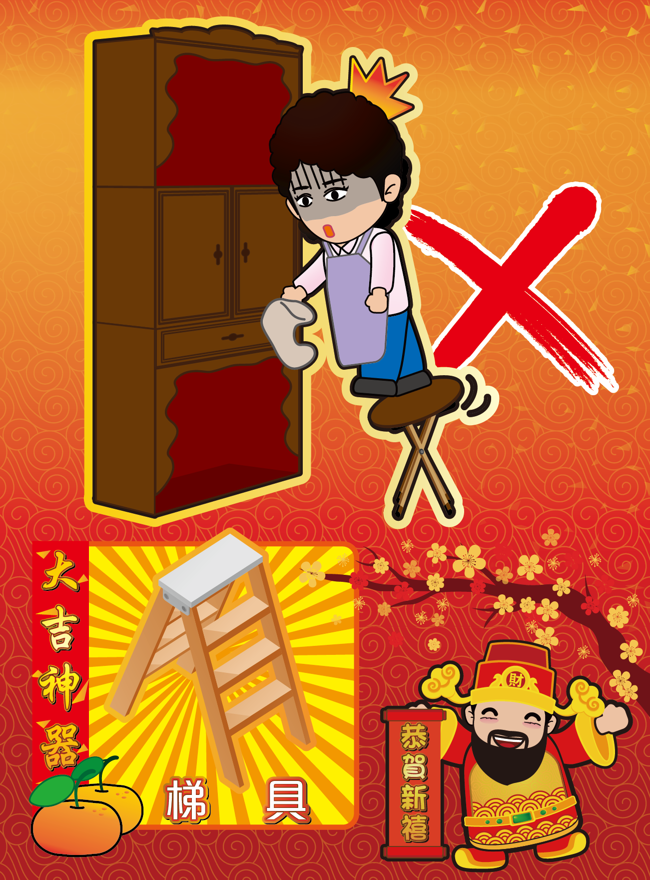 爬高爬低清洁时,要用四平八稳嘅工作台或梯具,而“摺櫈”依啲作为十大武器之首,唔系用嚟企嘅,留番嚟坐或者俾十八铜人用啦!而有辘嘅櫈就更加唔好用嚟企呀!