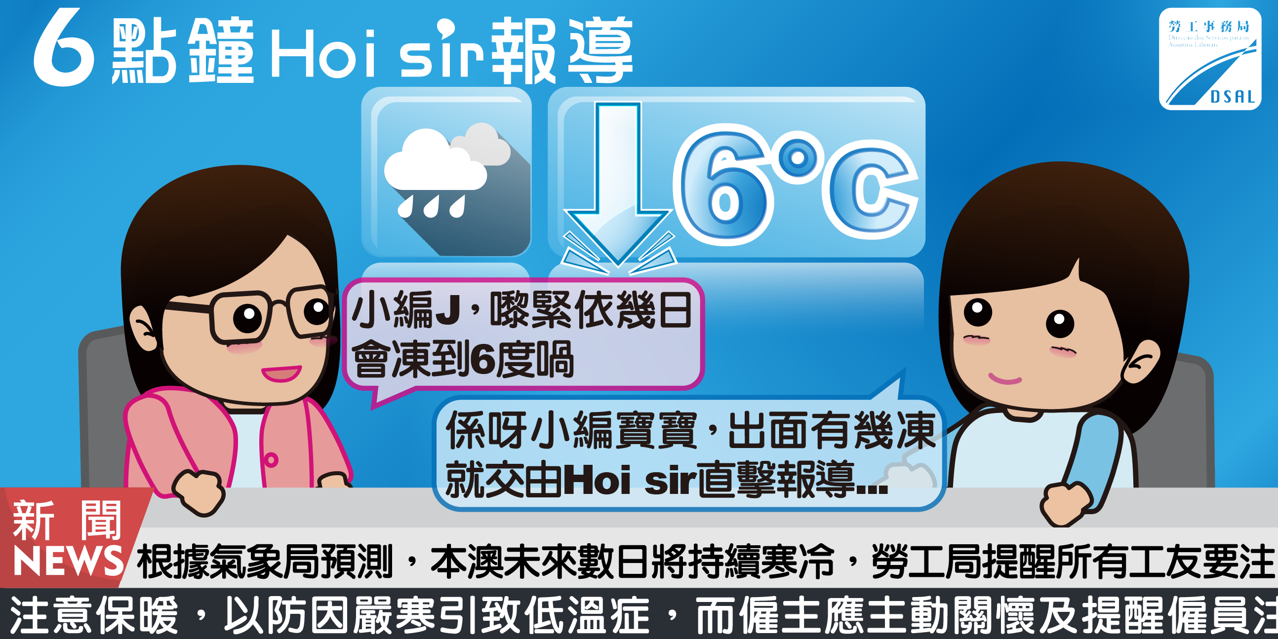 根据气象局预测,本澳未来数日将持续寒冷,劳工局提醒所有工友要注意保暖,以防因严寒引致低温症,而雇主应主动关怀及提醒雇员注意个人保暖,尽量减少雇员身处户外时间,以及为雇员提供适当的保暖措施。