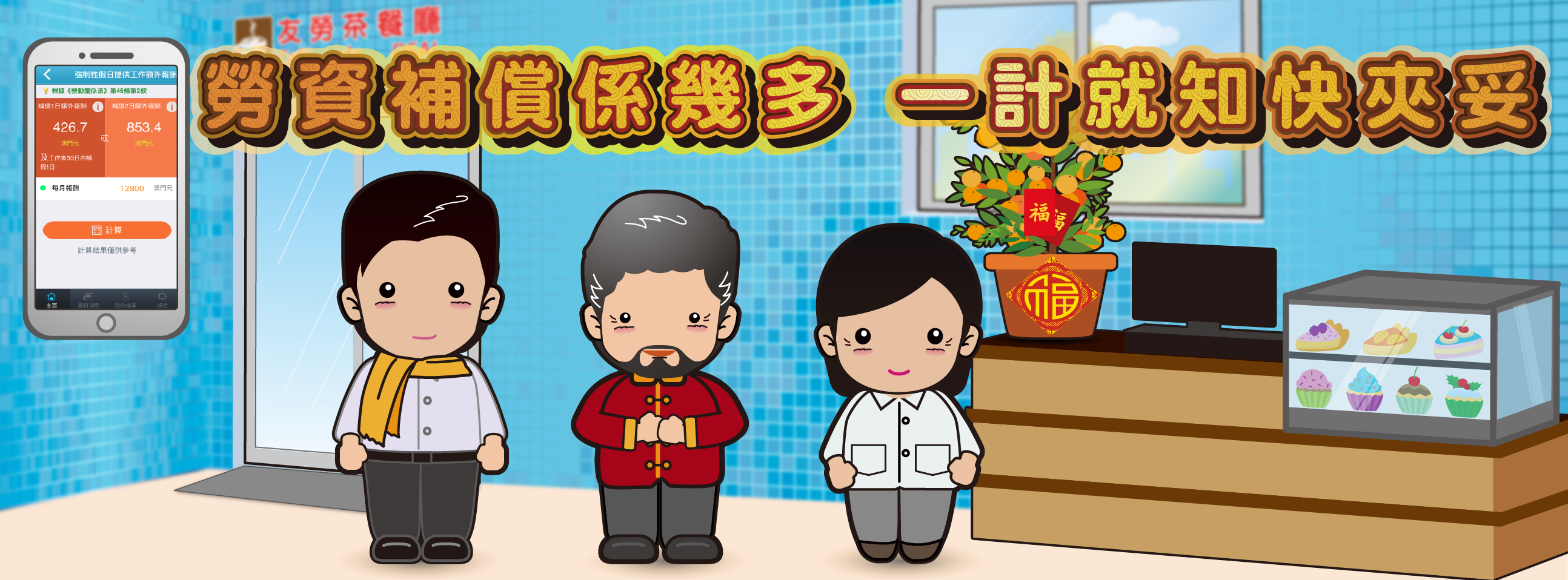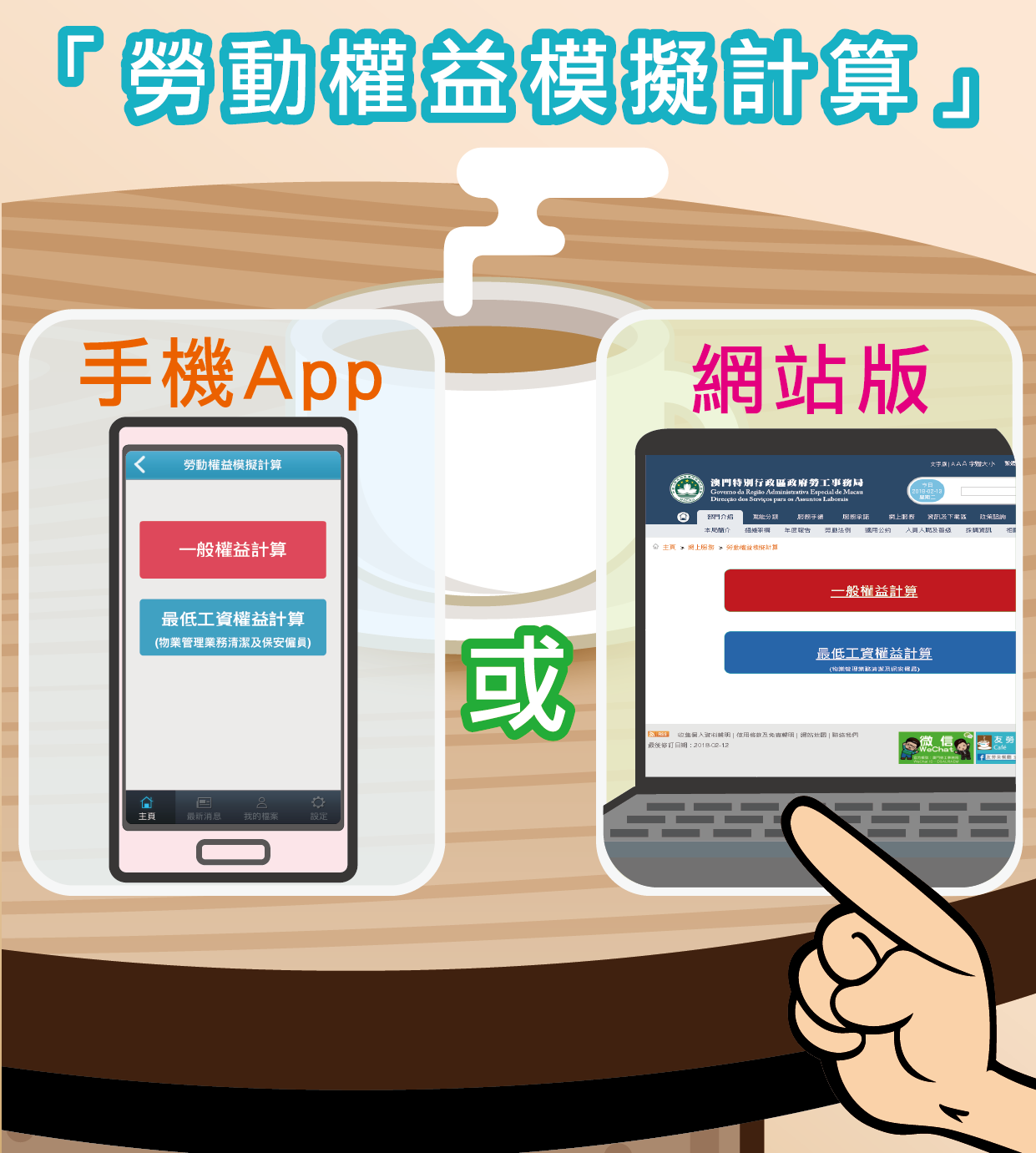 小编突然出现:系呀系呀!快D下载我地个手机App,入面设有「劳动权益模拟计算」,依家连网站都新增咗呢个功能添!市民由即日起登入劳工事务局网页(http://www.dsal.gov.mo/zh_cn/standard/menuugoto.html ),