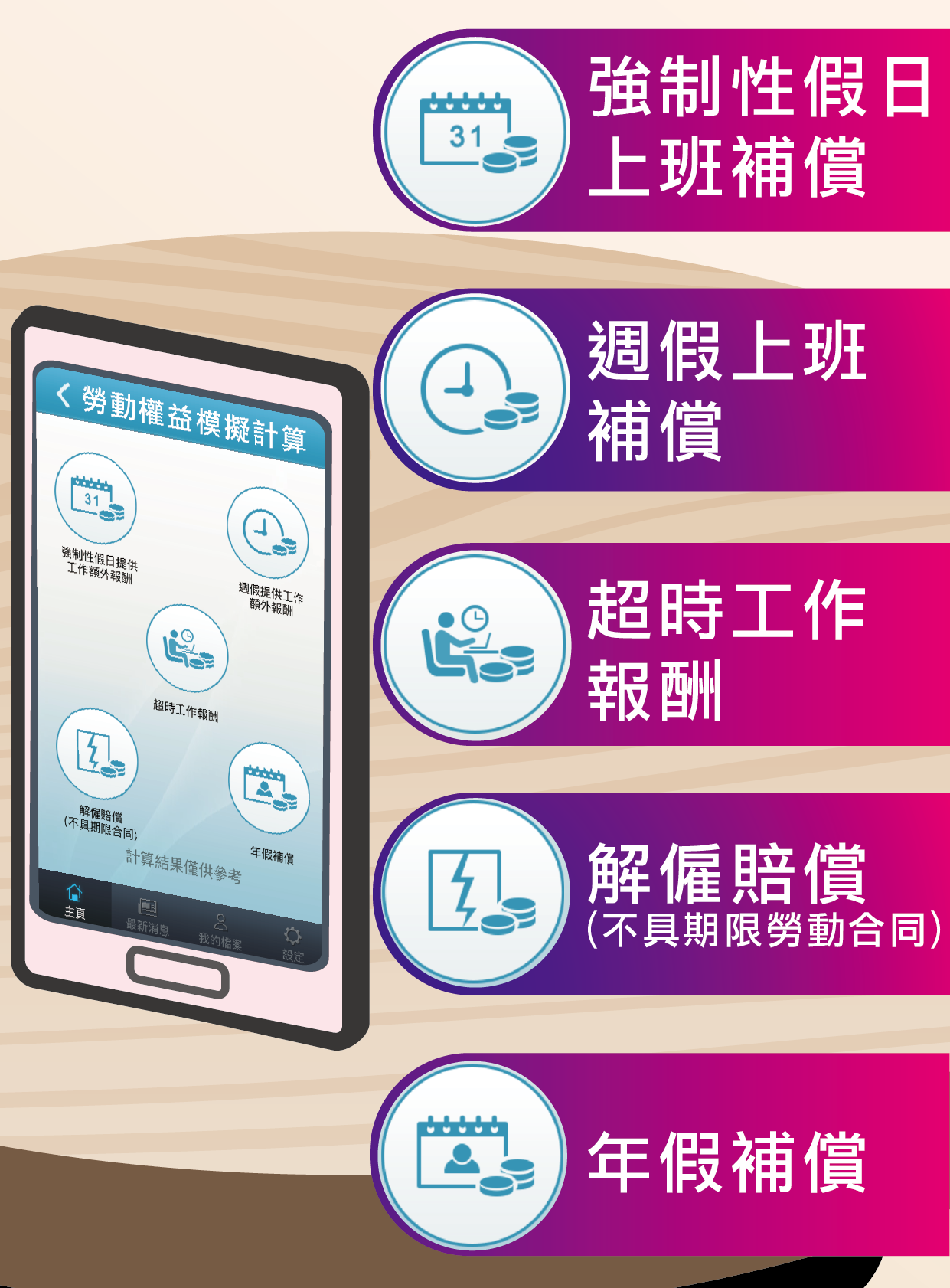 就可以简单输入薪金资料,计算「一般雇员」及适用「最低工资」的雇员的各项补偿,包括:强制性假日上班补偿、周假上班补偿、未享受年假日数补偿、超时工作报酬、解雇赔偿(不适用於外地雇员及具期限劳动合同)。