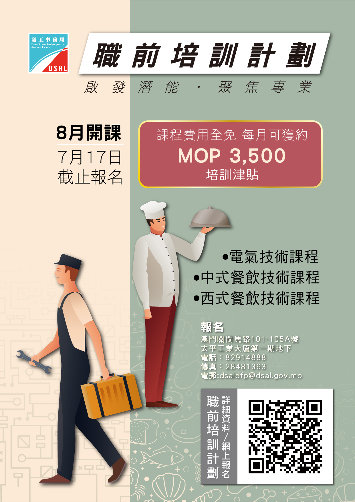 劳工事务局专为青年而设的“职前培训计划”将於8月份开课,并由即日起至7月17日接受报名。课程包括「电气技术课程」、「中式餐饮技术课程」、「西式餐饮技术课程」,欢迎有志成为电工及厨师的澳门青年报读。