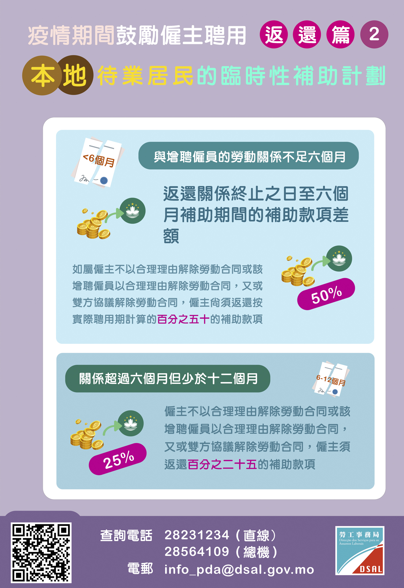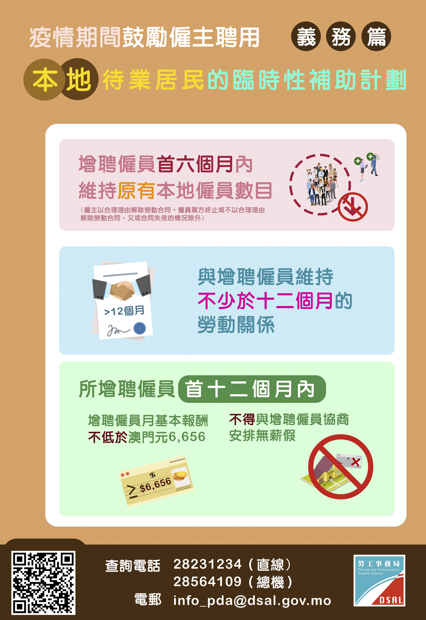 为了让社会各界对《疫情期间鼓励雇主聘用本地待业居民的临时性补助计划》(下称“补助计划")有更深入的了解,劳工事务局举办多场讲解会以及透过多媒体展开一系列宣传活动。