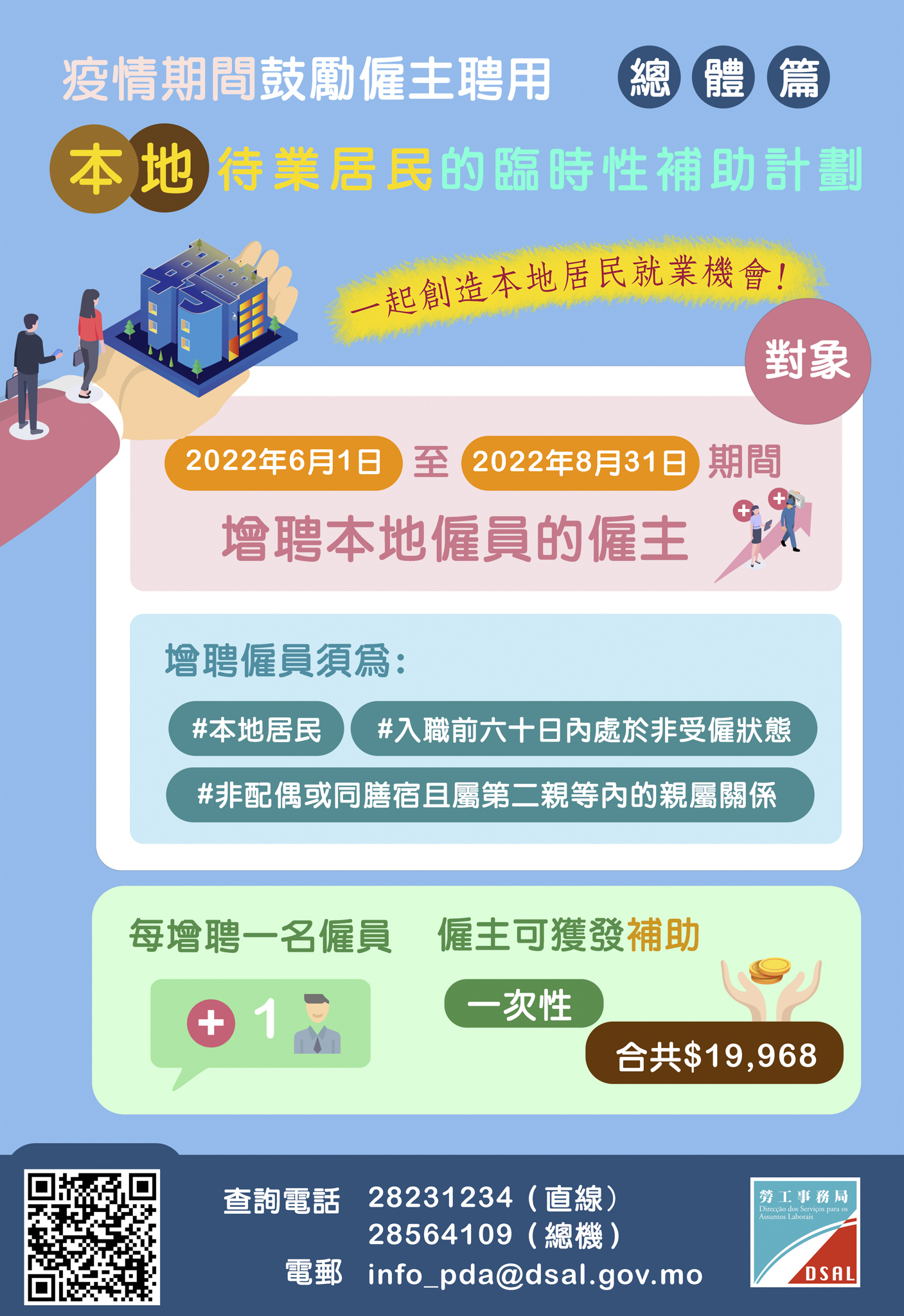 “补助计划"於今年6月1日至8月31日期间推出《疫情期间鼓励雇主聘用本地待业居民的临时性补助计划》(下称"补助计划"),雇主每增聘一名本地待业居民,可获一次性发放一万九千九百六十八澳门元的补助款项,补助名额不设上限。
