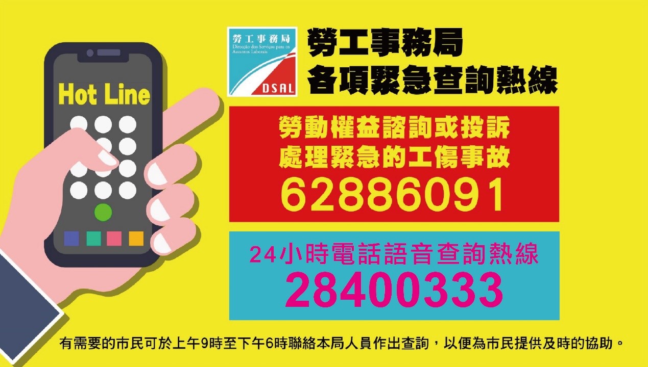 为了协助市民处理紧急的劳资纠纷或工伤事故,劳工事务局将在以下节假日期间(2022年10月1日至5日),特设紧急热线电话62886091,有需要的市民可於该段期间的上午9时至下午6时,联络劳工局人员作出查询,以便为市民提供适切的协助。