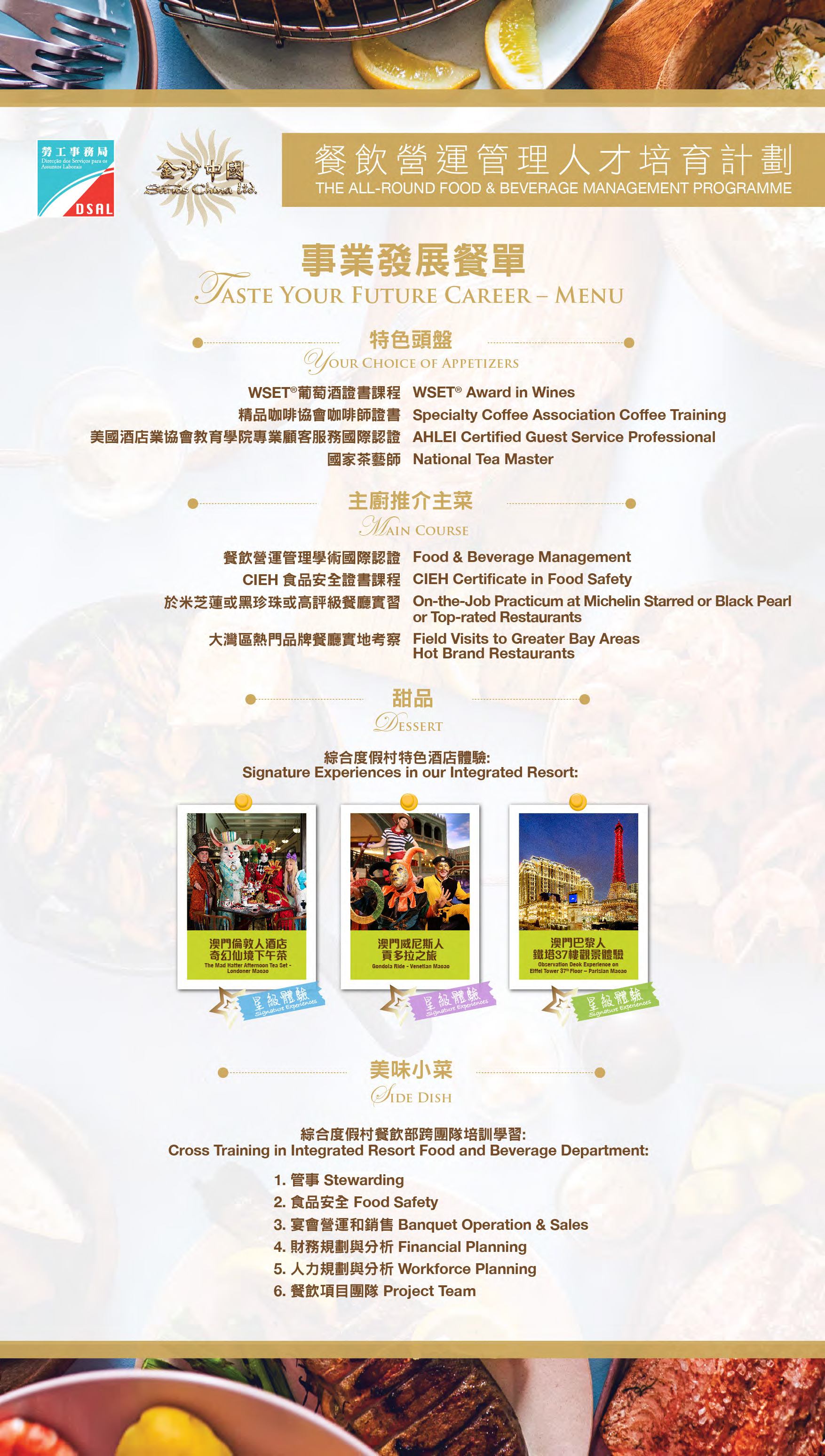 计划之培训内容涵盖餐饮营运管理知识、葡萄酒及茶艺知识,以及食品安全常识等。完成课程后将获安排考取多个本地及国际专业认证,包括“WSET®葡萄酒证书课程”、“国家茶艺师证书课程”、“餐饮营运管理学术国际认证”、“第二级CIEH食品安全证书”及“澳门职业技能认可基准(MORS)”等。培训期内企业会提供米芝莲或黑珍珠等星级餐厅之实习机会,并安排培训生前往大湾区热门品牌餐厅作实地考察,助培训生做好装备,快速拓展职业生涯。