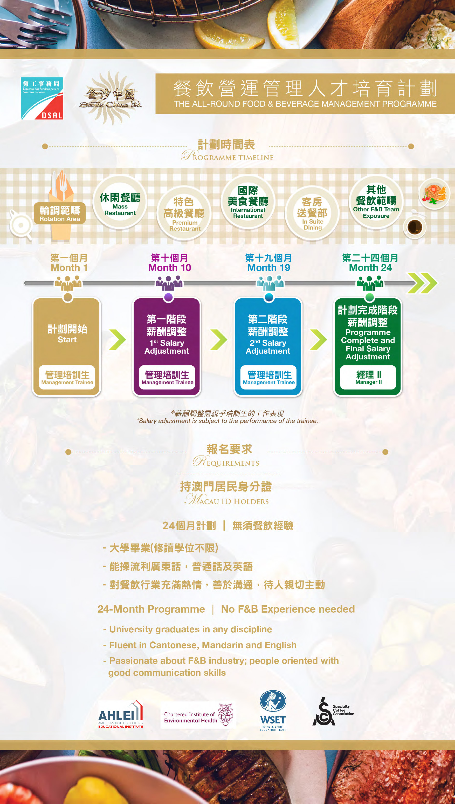 计划提供“餐饮营运管理培训生”职缺12个,获录取参加计划者,将接受一系列培训,在完成各阶段培训及通过考核后,薪金会作调升,并於入职后约第24个月晋升为“餐饮服务经理II”。