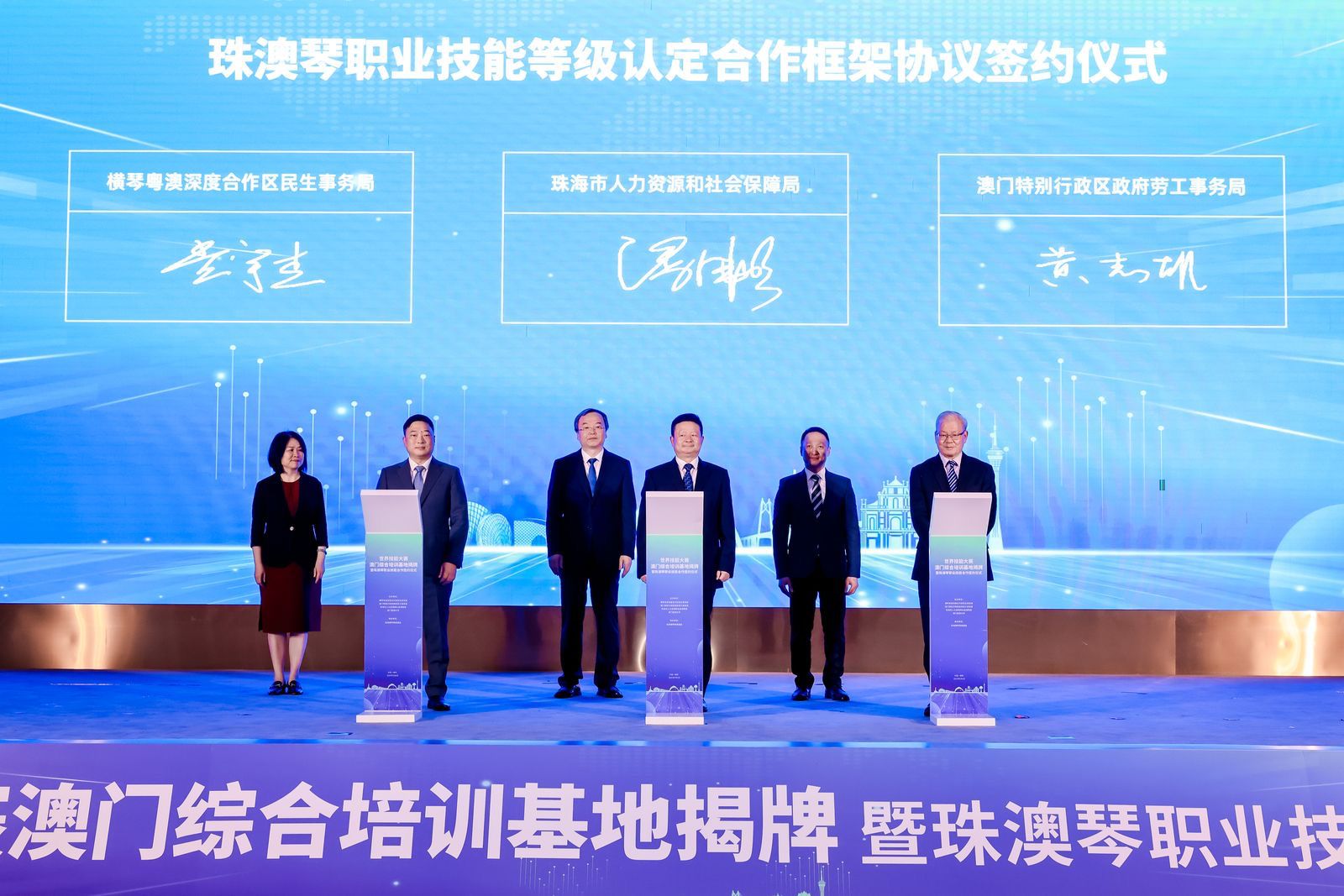 活动上,珠海市人社局、澳门劳工事务局、横琴合作区民生事务局签署了《珠澳琴职业技能等级认定合作框架协议》,开启珠澳琴三方技能人才工作全领域合作新篇章。该协议明确将充分发挥三方在技能人才工作方面的优势,建立长期稳定、互惠互利的合作关系,坚持“立足湾区、资源分享、优势互补、合作共赢、共谋发展”的原则,全面开展技能人才培训、实训、竞赛、评价、交流等各领域深度合作,促进三地技能人才精准培养、互通互认。同时三方将以联盟为平台开展全链条、全要素、全时空交流合作,通过“送教入澳” 、“请澳来珠” 、“送考到琴” 、“联合办赛” 、“一试多证”等多种方式,实现三方技能人才工作“标准共用、评价互认、供求匹配、深度融合”。