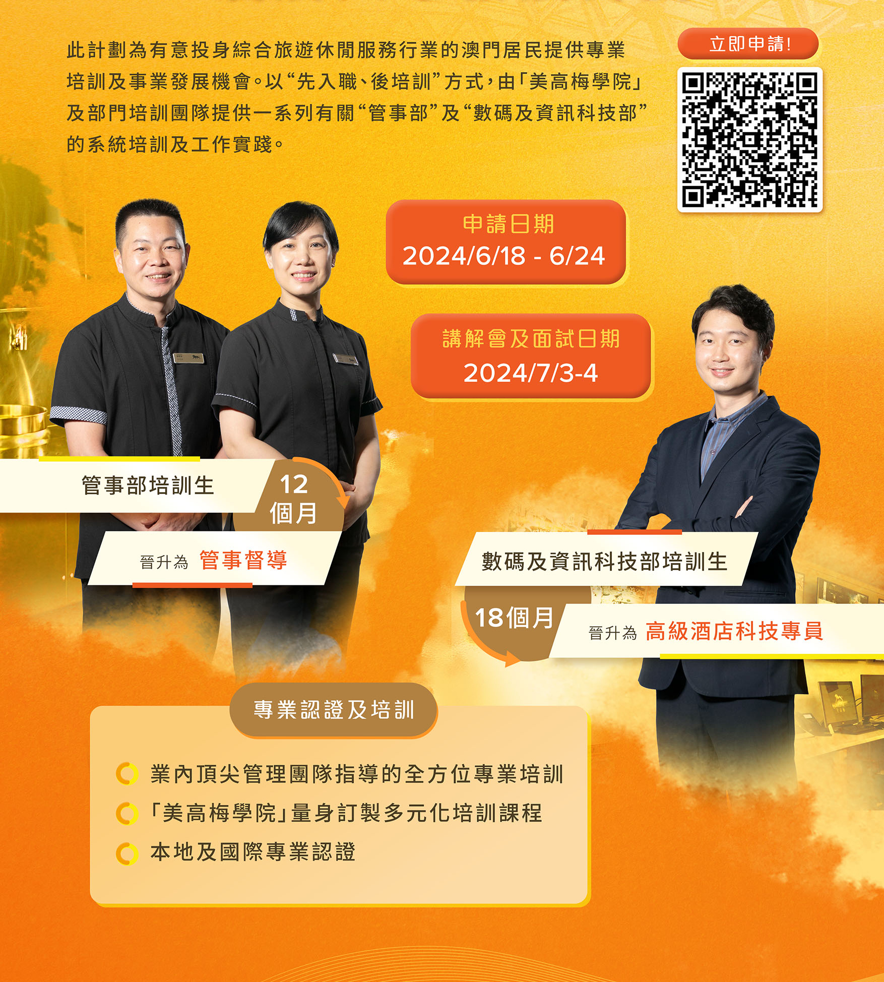 计划提供“数码及资讯科技部培训生"职缺3个及“管事部培训生"职缺15个,合共18个职缺。获录取参加计划者,美高梅将安排一系列专业培训及工作实践。“数码及资讯科技部培训生”的培训内容包括数码及资讯科技部整体运作、酒店专业影音系统培训、个案跟进及管理培训等;“管事部培训生”的培训内容包括酒店管事部整体运作、专业清洁剂认识及处理培训、存货管理及控制培训,以及考取酒店及饮食业职安卡等。