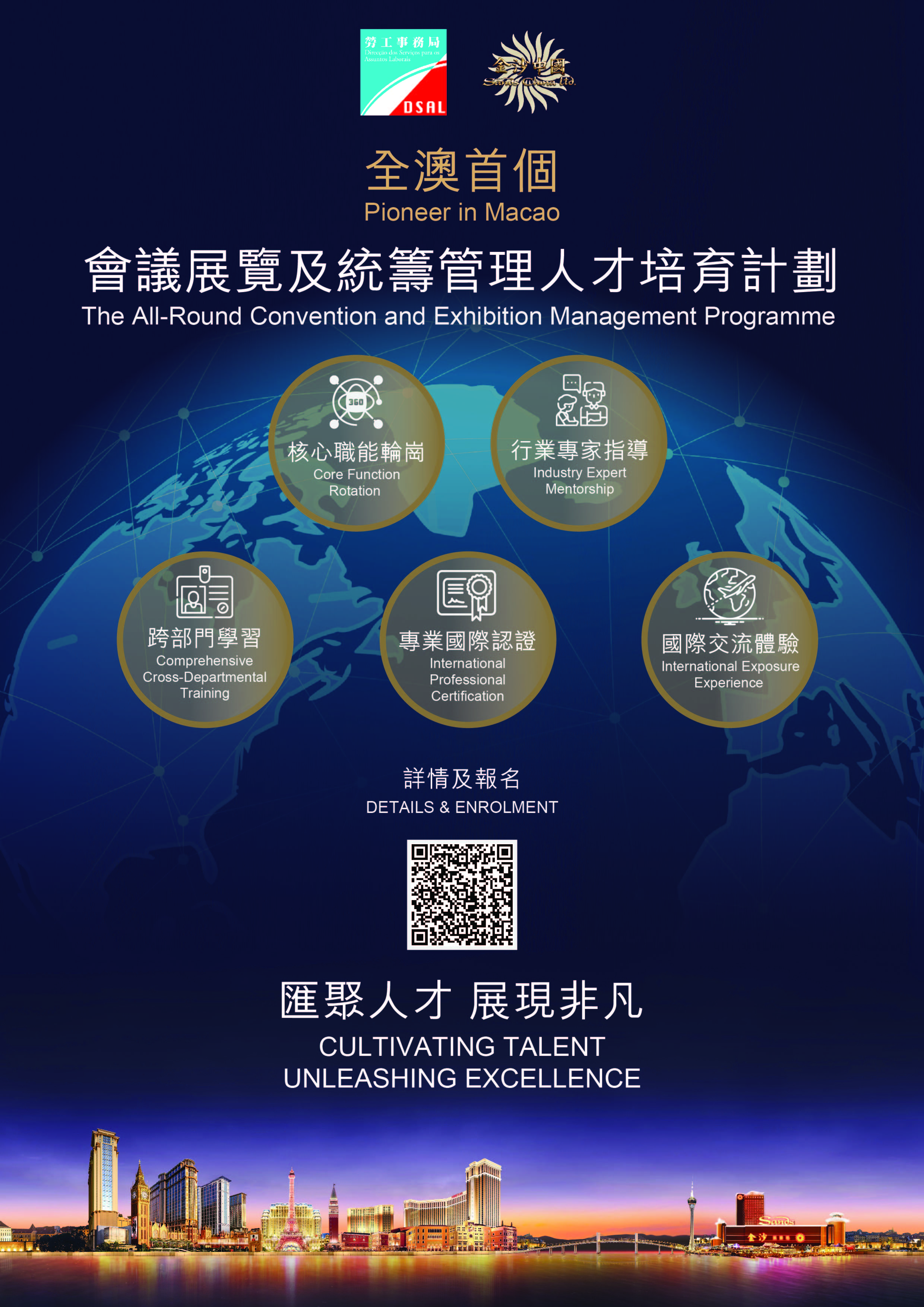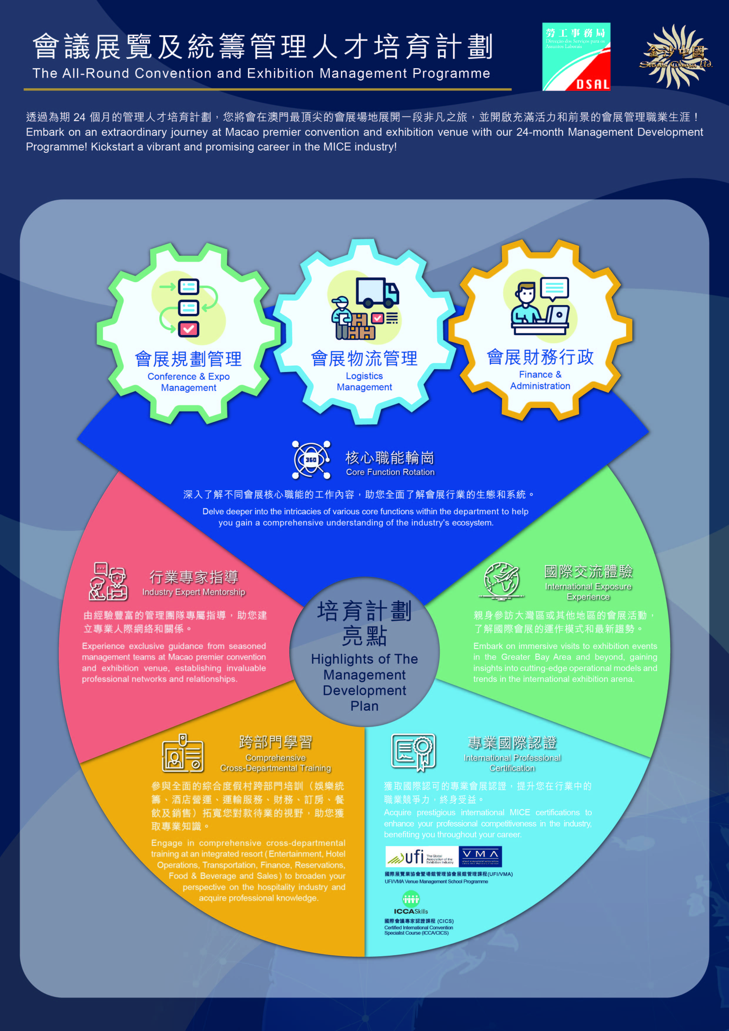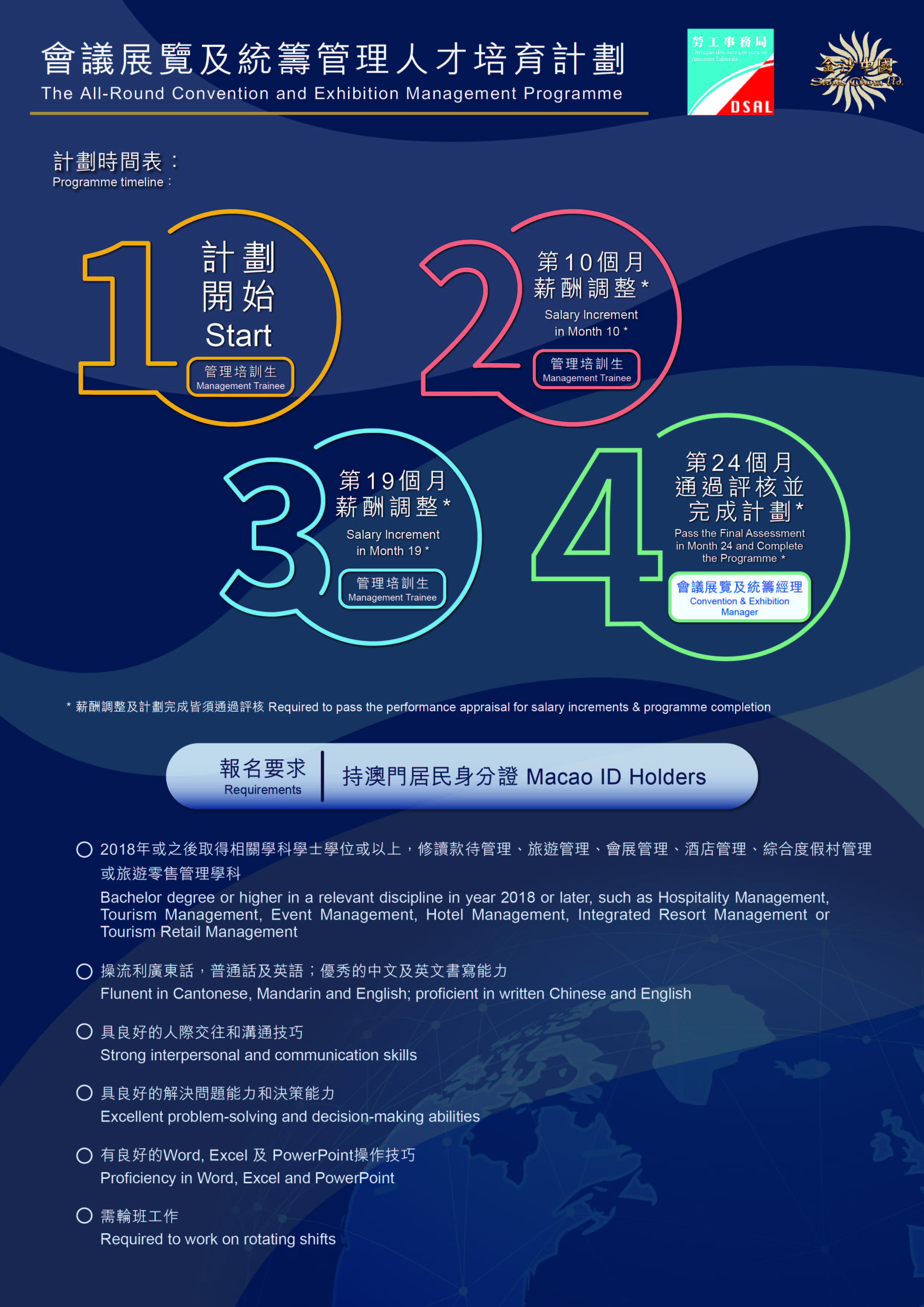 计划提供“会议展览及统筹管理培训生"职缺15个。获录取参加计划者,将接受一系列培训及工作实践。培训内容包括综合度假村会议展览及统筹部培训、领英缐上学习课程、综合度假村服务及个人工作效能课程、综合度假村跨部门学习等,并由公司安排考取国际会议专业认证(ICAA/CICS - Certified International Convention Specialist Course)、酒店及饮食业职安卡等认证。