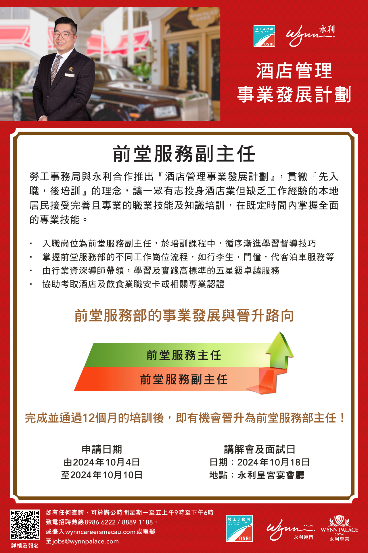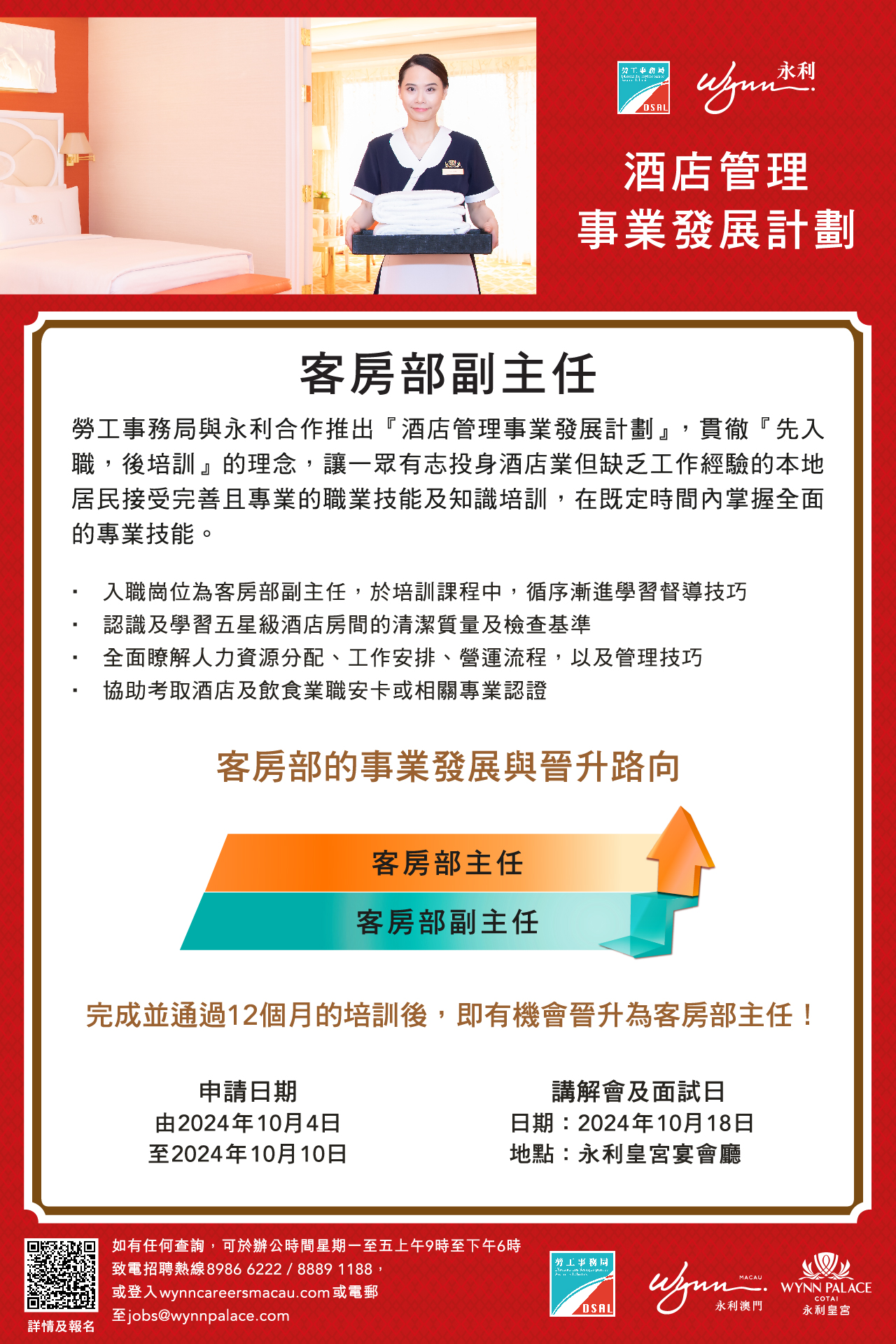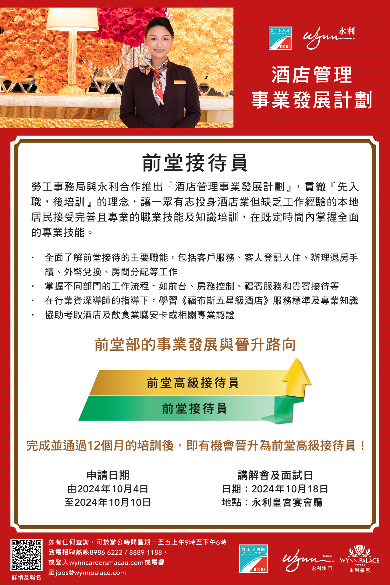 ,有意参加者可於10月4日至10日期间网上递交申请。申请期结束后,永利将陆续通知符合条件的申请人参加讲座,详细说明计划的各项培训内容及职涯发展阶梯,讲座后随即安排面试。有关讲座及面试日期为10月18日。请参加者保持电话畅通,以便接收永利进一步通知。