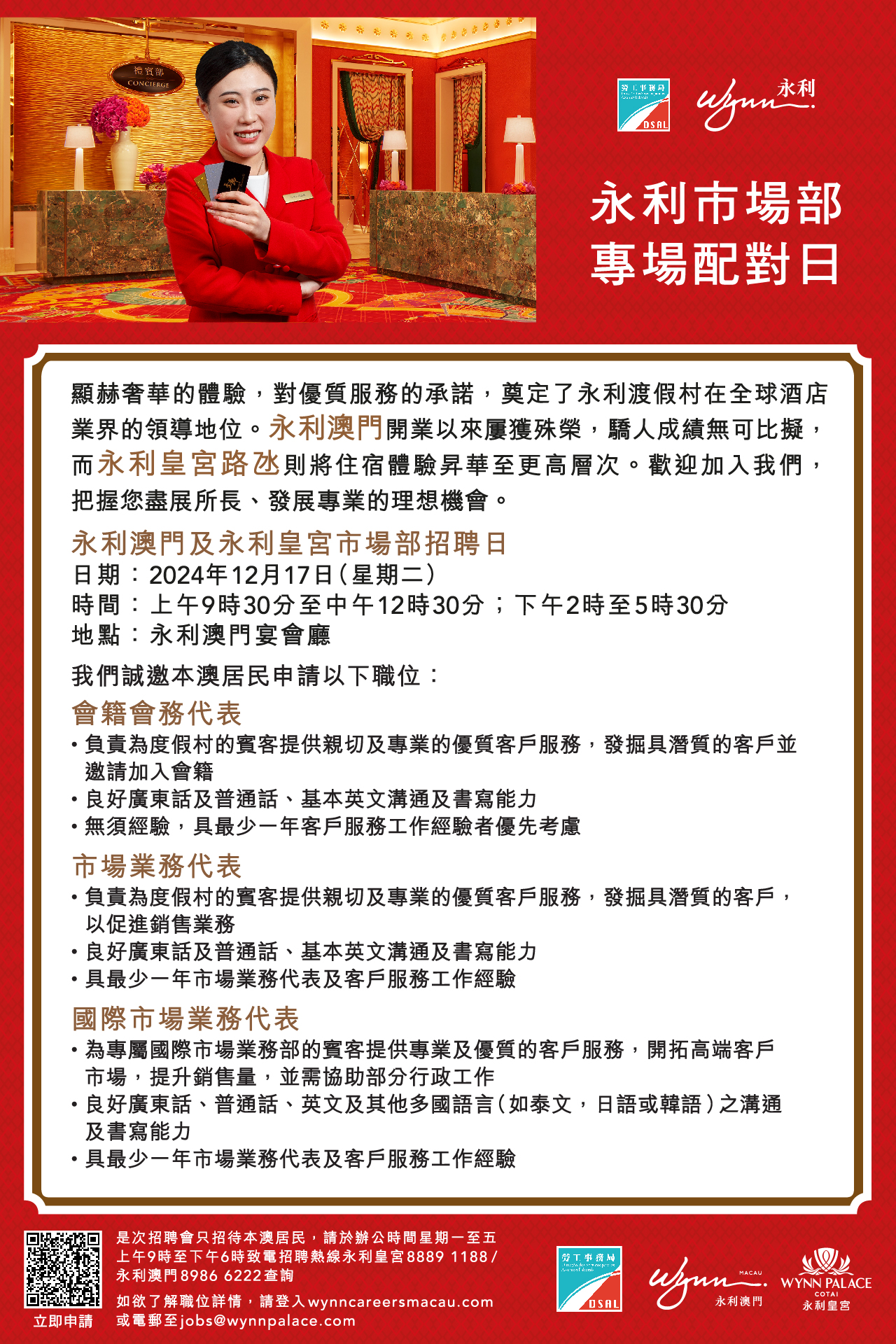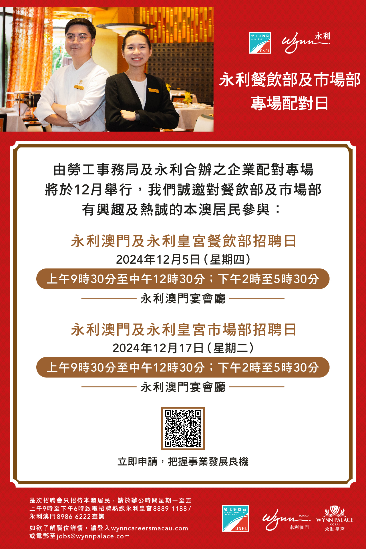 为配合澳门经济适度多元发展,以及促进澳门居民就业,劳工事务局和永利澳门有限公司(下称“永利澳门”)合作於12月5日及12月17日举办专场配对会,藉此招聘有意投身综合旅游休閒行业的澳门居民。