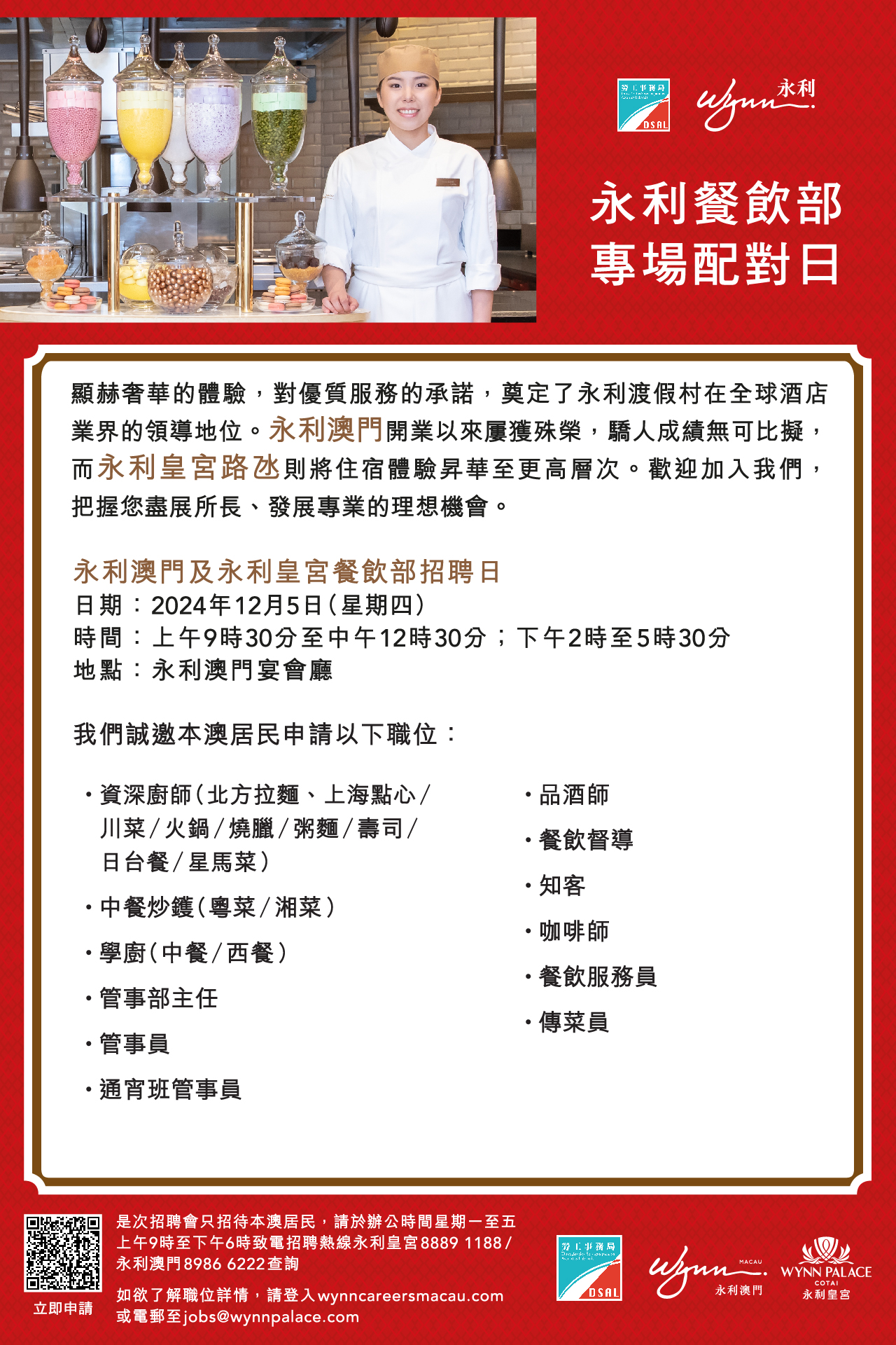 有意参加配对会的澳门居民,可登入劳工局行业专场配对会专页(https://www.dsal.gov.mo/zh_cn/standard/wynn_jobmatching_session.html)报名,名额有限,欲报从速。