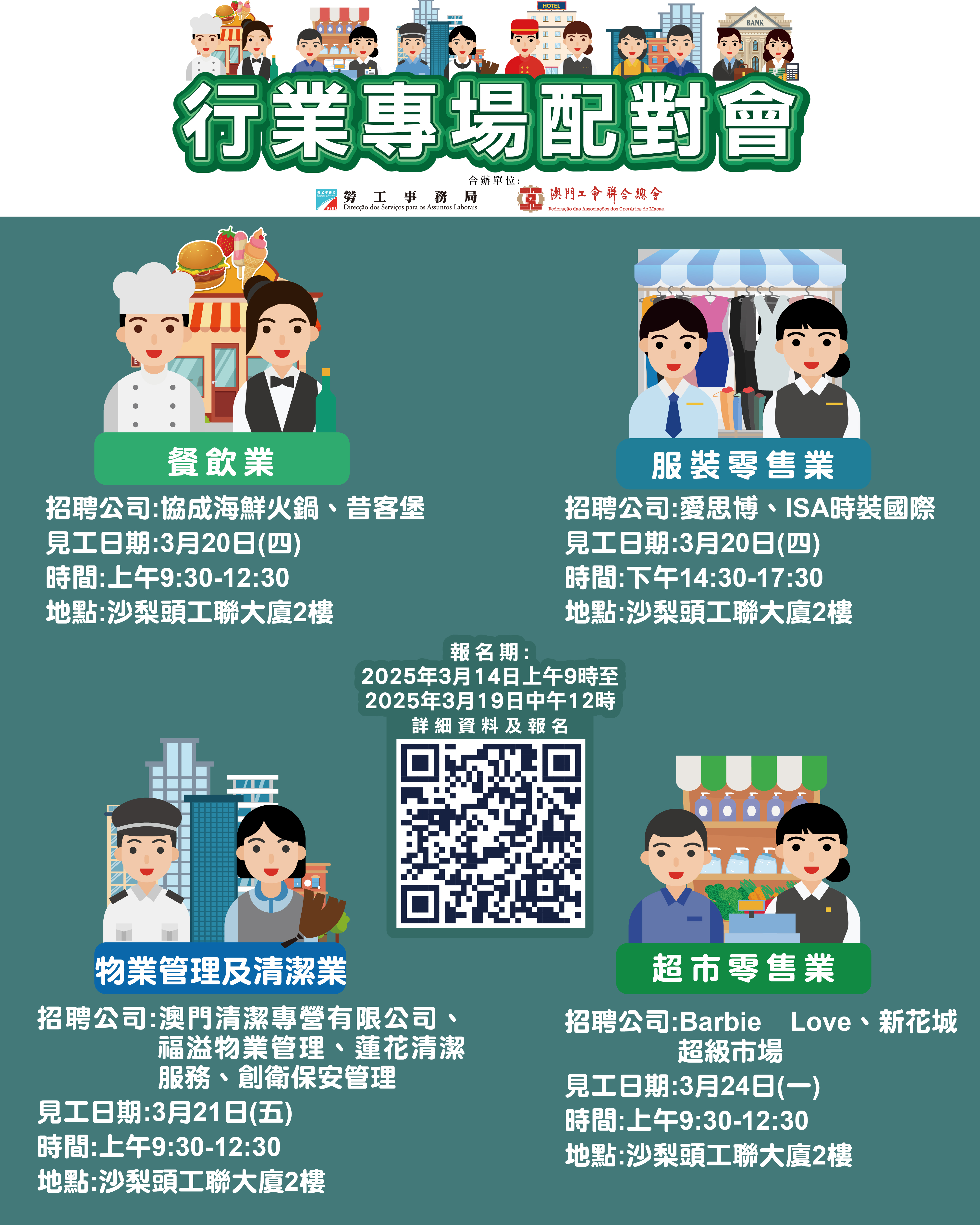 3月20日上午餐饮业配对会、3月20日下午服装零售业配对会、3月21日上午物管及清洁业配对会与3月24日上午超市零售业配对会均在澳门工会联合总会二楼(沙梨头海边街2-6号工联大厦)举行。报名日期为3月14日上午9时至3月19日中午12时。