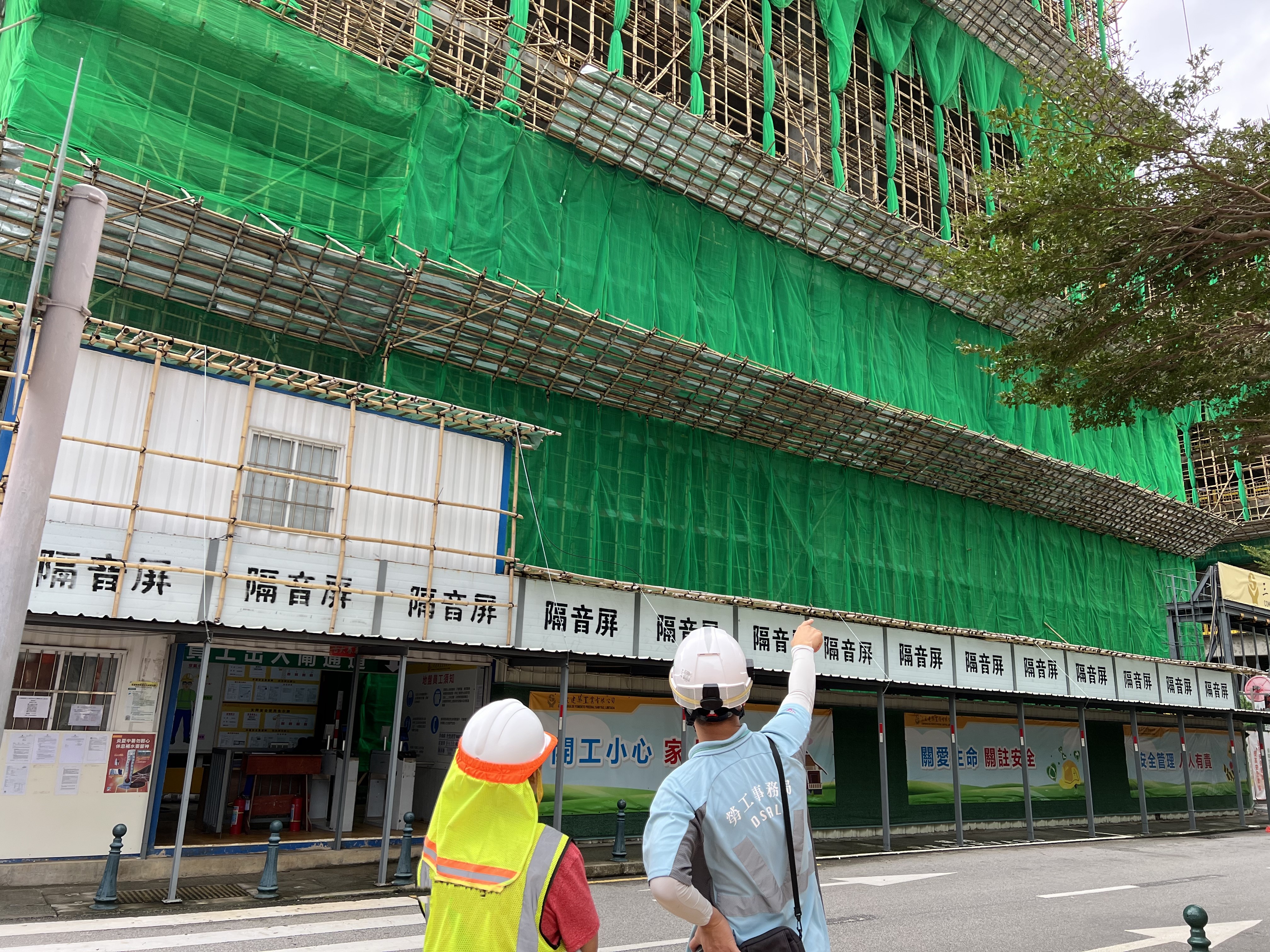 劳工局巡查人员向工作人员讲解颱风后的安全措施