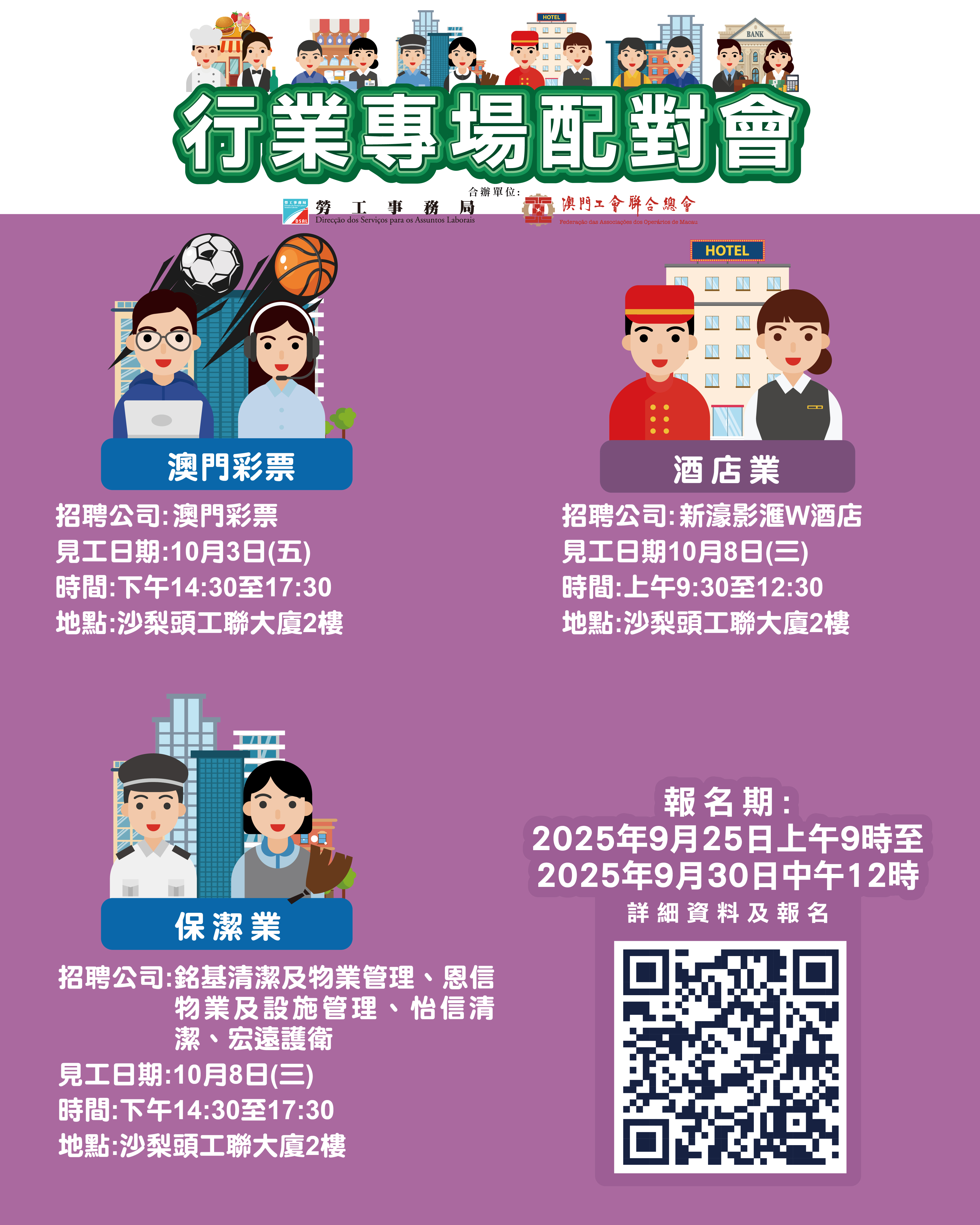 10月3日下午澳门彩票有限公司专场配对会、10月8日上午酒店业专场配对会及同日下午保洁业专场配对会均在澳门工会联合总会二楼(沙梨头海边街2-6号工联大厦)举行。报名日期由即日起至9月30日中午12时。