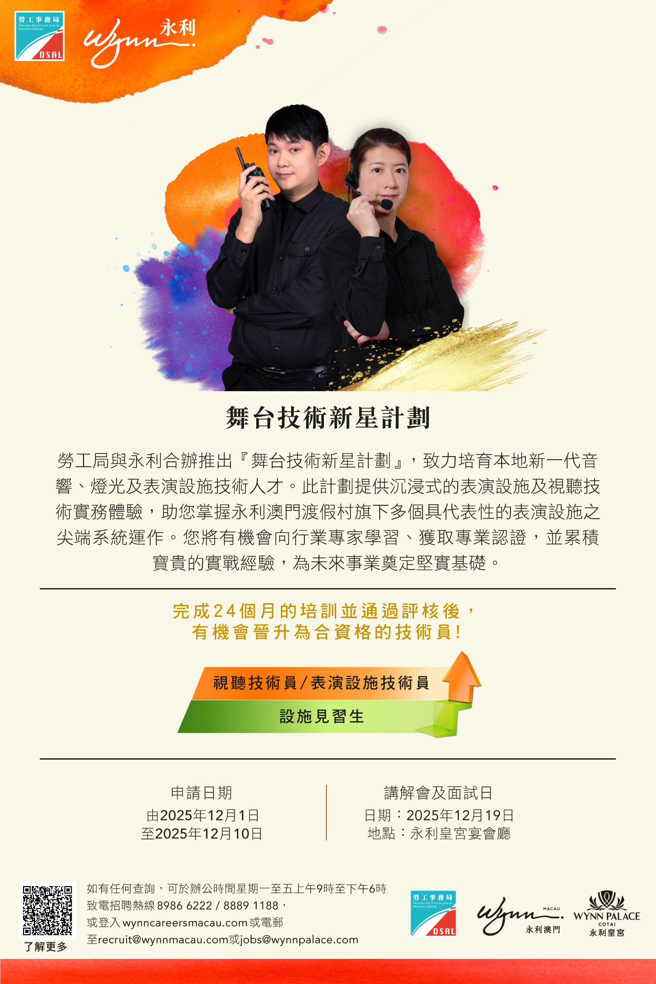 为促进本地人才职业发展,劳工事务局(下称“劳工局")和永利澳门有限公司(下称“永利")合作推出“舞台技术新星计划",以“先入职、后培训"方式,为本澳居民提供专业培训及工作实践机会,即(1)日起接受申请。