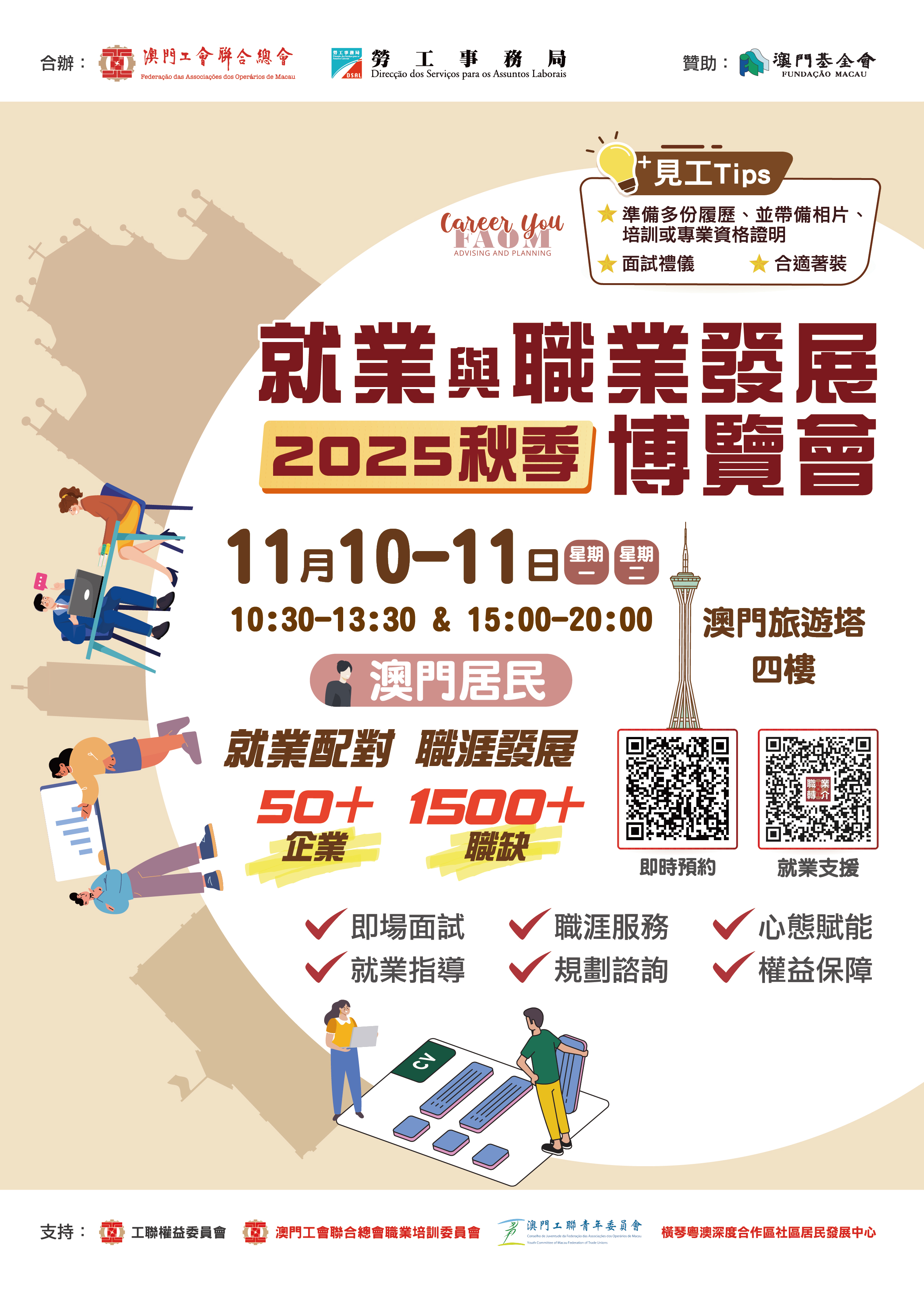 由勞工事務局與澳門工會聯合總會合辦的“2025秋季就業與職業發展博覽會”,將於2025年11月10日至11日舉行,博覽會由10月23日至11月7日中午12時開放網上預約進場