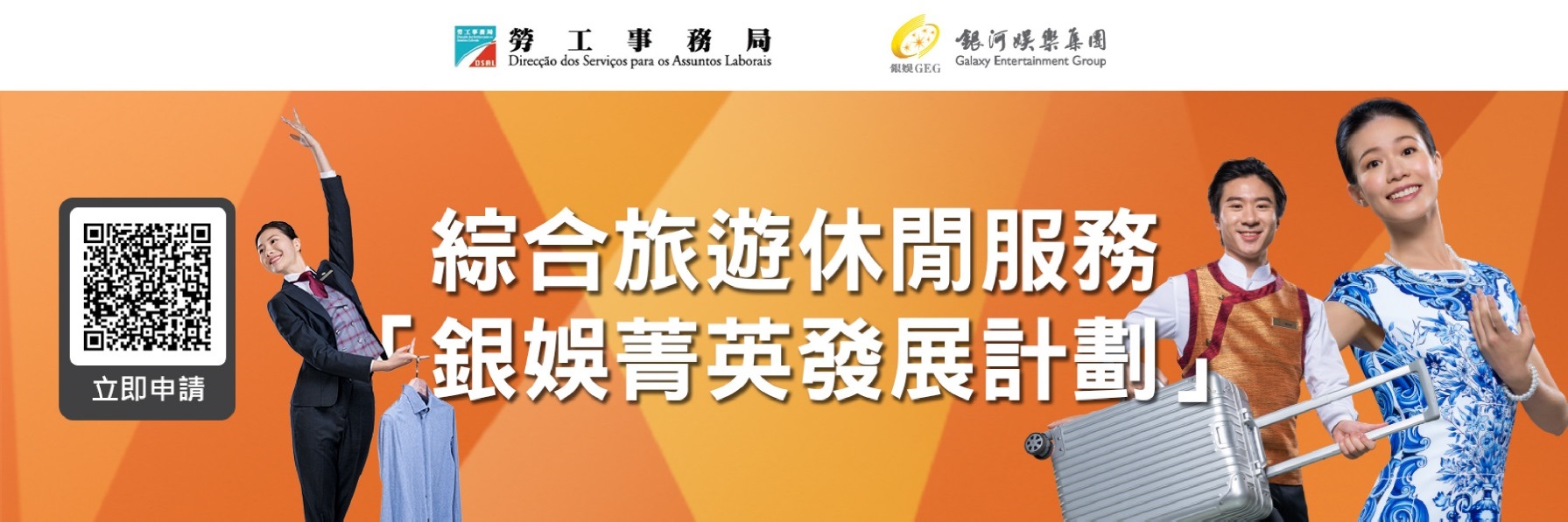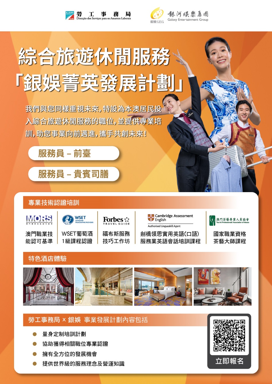 為支持本地人才全面發展,拓展多元職涯路向,勞工事務局(下稱勞工局)與銀河娛樂集團(下稱銀娛)合辦“銀娛菁英發展計劃(酒店營運)”,為有志投身綜合旅遊休閒服務行業的澳門居民提供全方位培訓及事業發展機會。透過先入職、後培訓方式,提供一系列有關酒店營運的專業培訓及工作實踐。計劃完成後,視乎考核結果及個人表現,良好表現者將有機會獲晉升,“服務員—前臺”可獲晉升為“助理經理—前臺”;“服務員—貴賓司膳”可獲晉升為“助理經理—貴賓司膳”,助本地居民發展職涯。