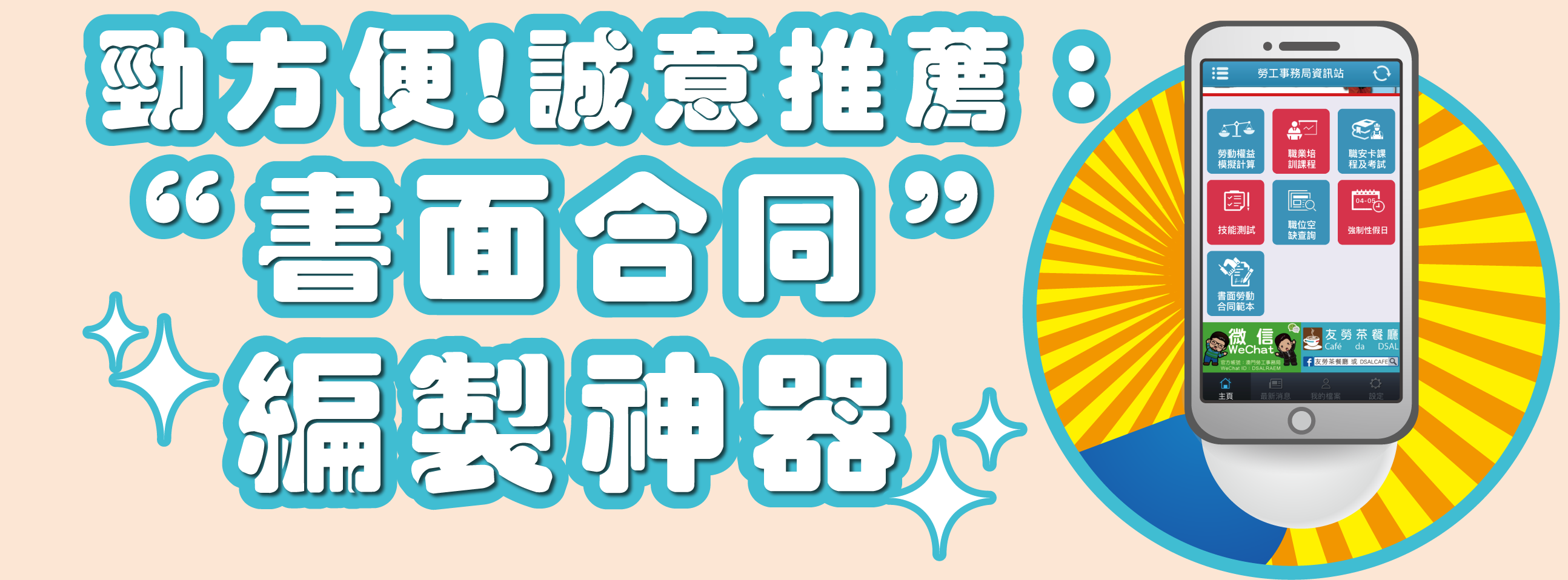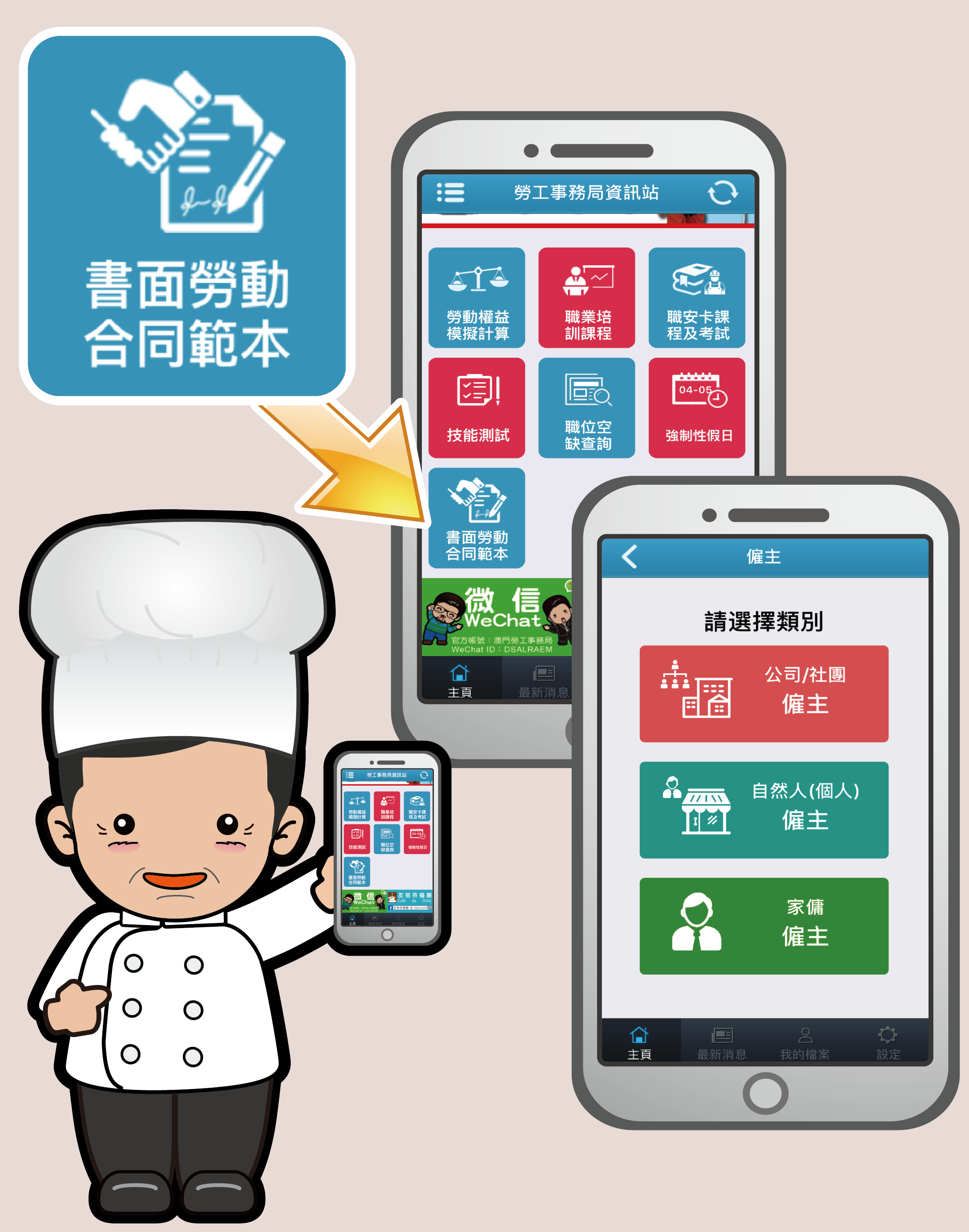 輝哥:你咪咁OUT啦~ 你之前咪下載左勞工局個手機app嘅,佢而家新增左個編製「書面合同」嘅功能,可以喺手機上編製8種不同類型嘅合同,包括本地僱員嘅合同、外地僱員嘅合同、家務工作僱員嘅合同,以及「最低工資」僱員嘅合同。我而家就開比你睇!