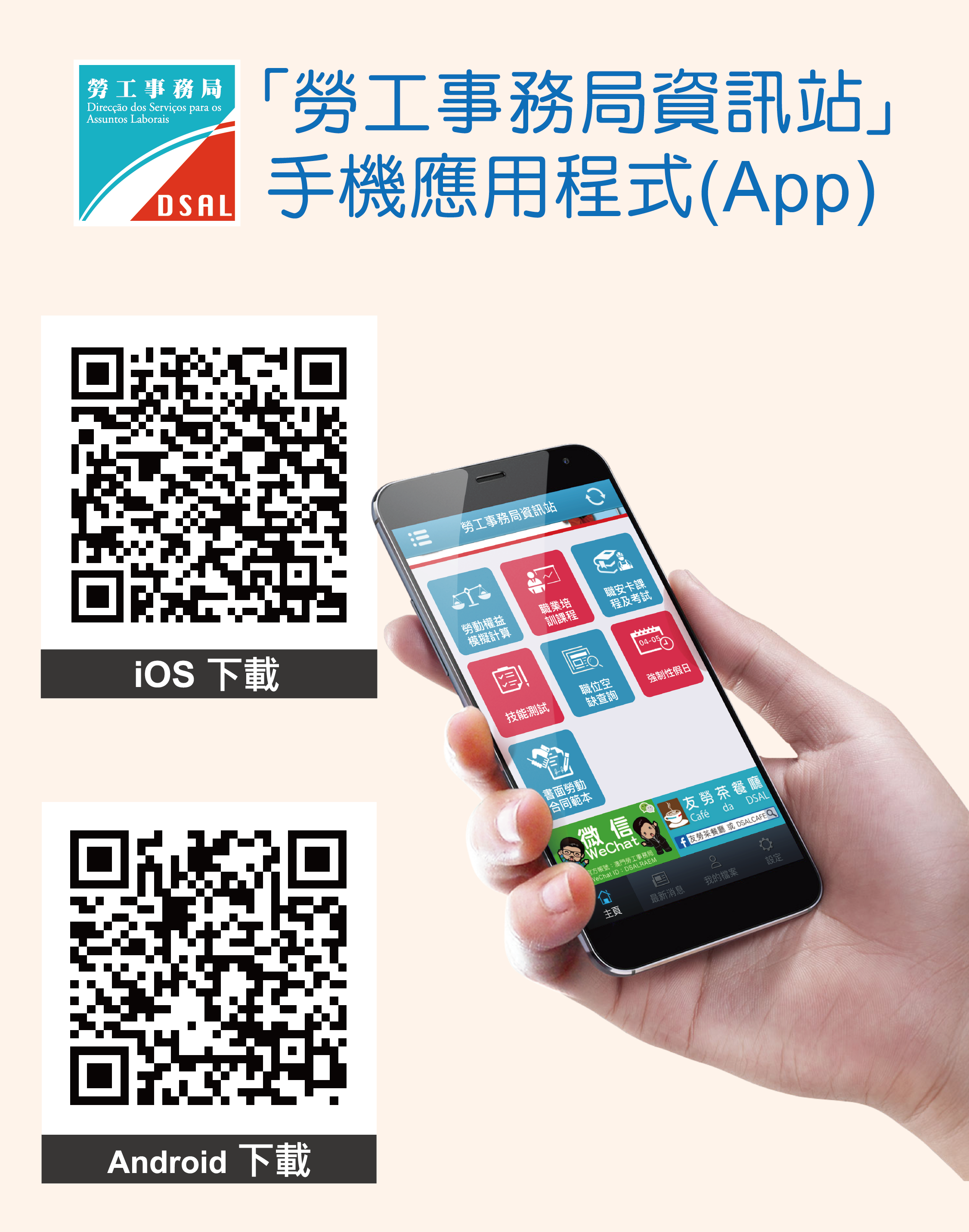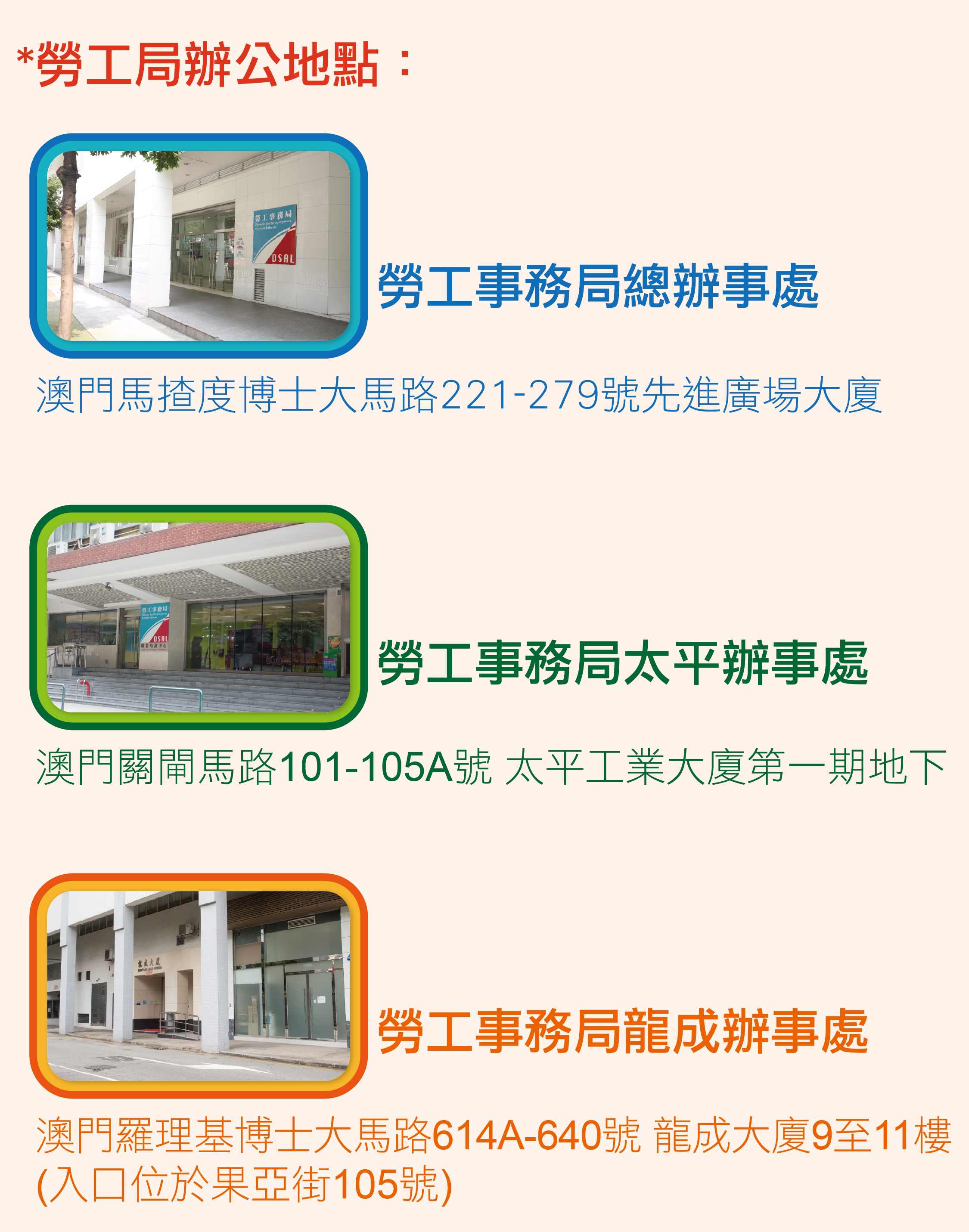 地址:澳門馬揸度博士大馬路221-279號先進廣場大廈 電話:(853) 2856 4109 傳真:(853) 2855 0477 電郵:dsalinfo@dsal.gov.mo