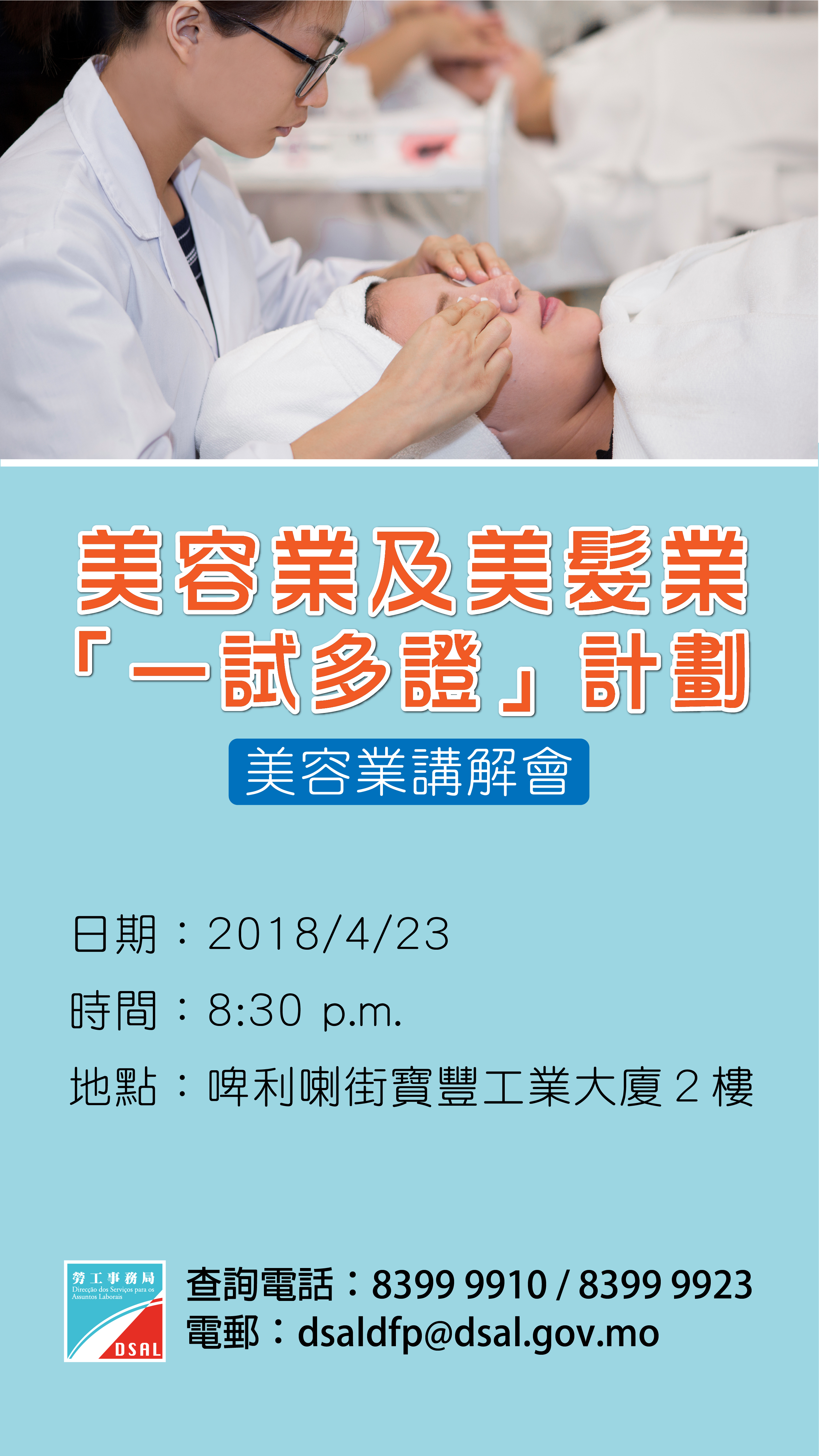 作為美容大師嘅你,係唔係好有興趣想知多D有關認證嘅內容呢?咁你就唔好錯過4月23日,晚上8時30分嘅「美容業一試多證」講解會。到時,勞工局會為大家解說依個「美容業一試多證」嘅考取資格同有關內容~