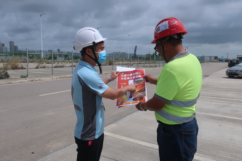與此同時,勞工局人員亦於巡查期間,提醒承造商因應溫度變化,合理安排工友的工作輪換,尤其是應定期安排長時間在戶外環境工作的工友在陰涼及通風良好的地方小休,建議上午10時後安排15分鐘小休,下午3時後安排30分鐘小休,以預防中暑。同時現時處於颱風季節,應對建築物及建築工地做好預防措施,特別是工地內的棚架、起重機械(例如天秤)和建築物的窗戶和外牆的懸掛物等,並應由專業人員作詳細檢查和加固措施,加強注意職安健事項,以保障工友及公眾安全。