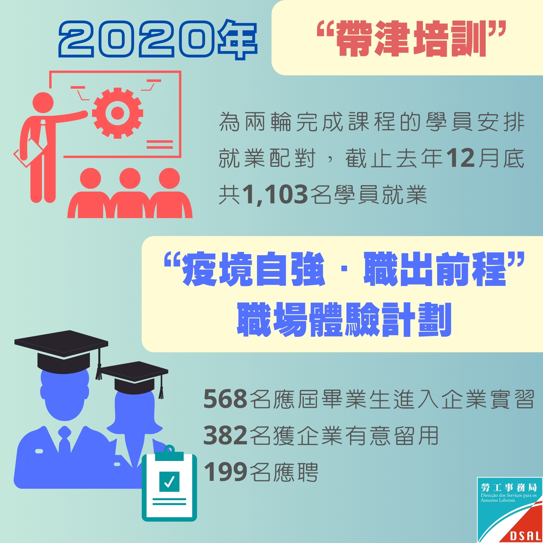 2020年配合特區政府推出的經援措施,勞工局於去年三月及九月推出兩輪“帶津培訓”,並為完成課程的學員安排就業配對,截至12月底,已有1,103名學員就業,並獲發培訓津貼。