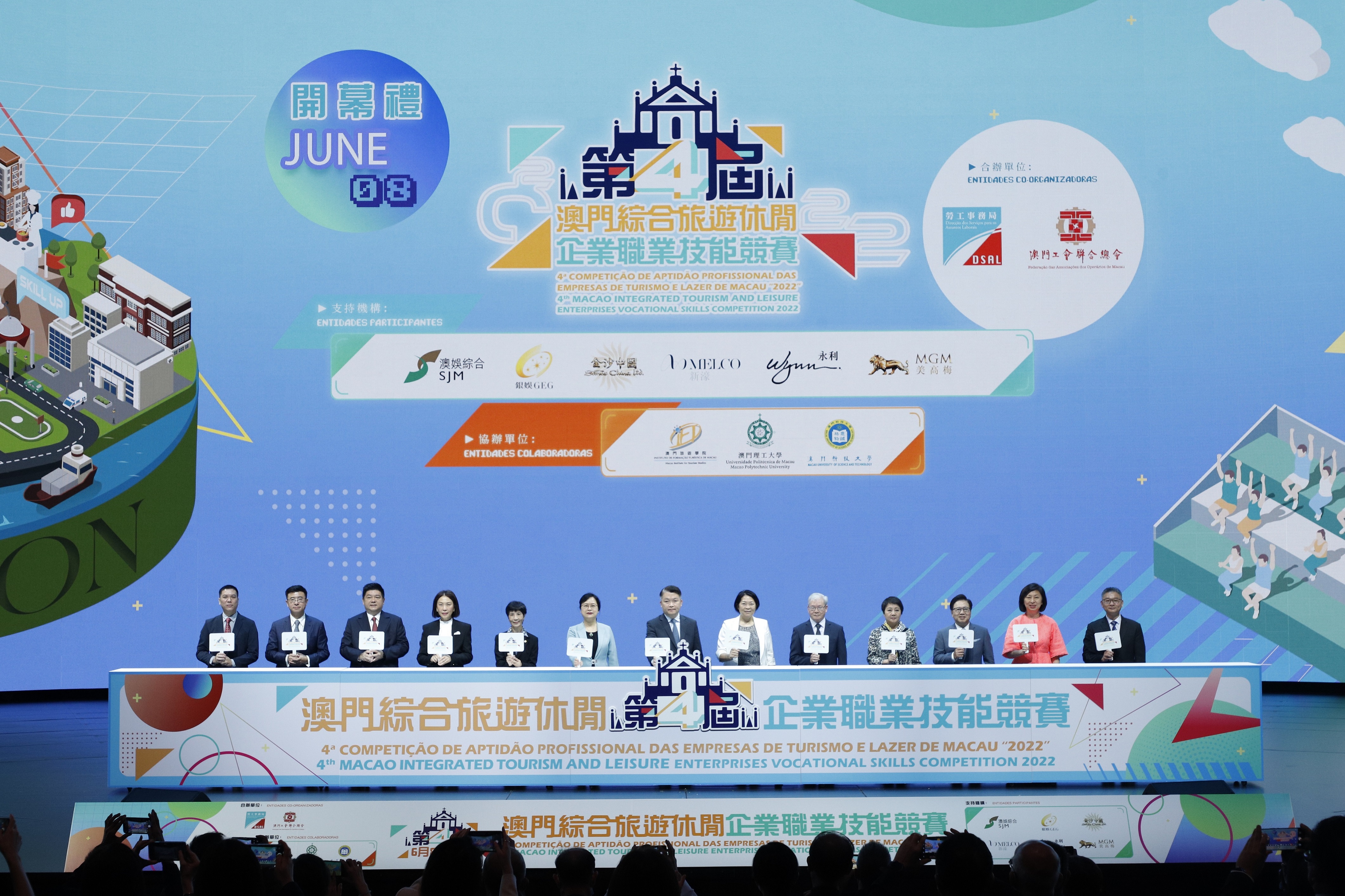 啟動儀式由澳門特別行政區行政長官代表、經濟財政司長李偉農,中央人民政府駐澳門特別行政區聯絡辦公室副主任嚴植嬋,廣東省總工會副主席杜玲,勞工事務局局長黃志雄,澳門工會聯合總會會長何雪卿,澳娛綜合度假股份有限公司常務董事兼福諮會主席梁安琪,銀河娛樂集團人力資源及行政集團董事呂慧玲,金沙中國有限公司總裁王英偉,新濠博亞娛樂有限公司首席顧問黃昇雄,永利澳門有限公司副主席兼執行董事陳志玲,美高梅總裁及首席營運官王志琪,澳門勞工事務局副局長陳元童,第四屆澳門綜合旅遊休閒企業職業技能競賽籌委會主任蔡錦富主禮。勞工事務局局長黃志雄和工聯總會會長何雪卿先後致詞。
