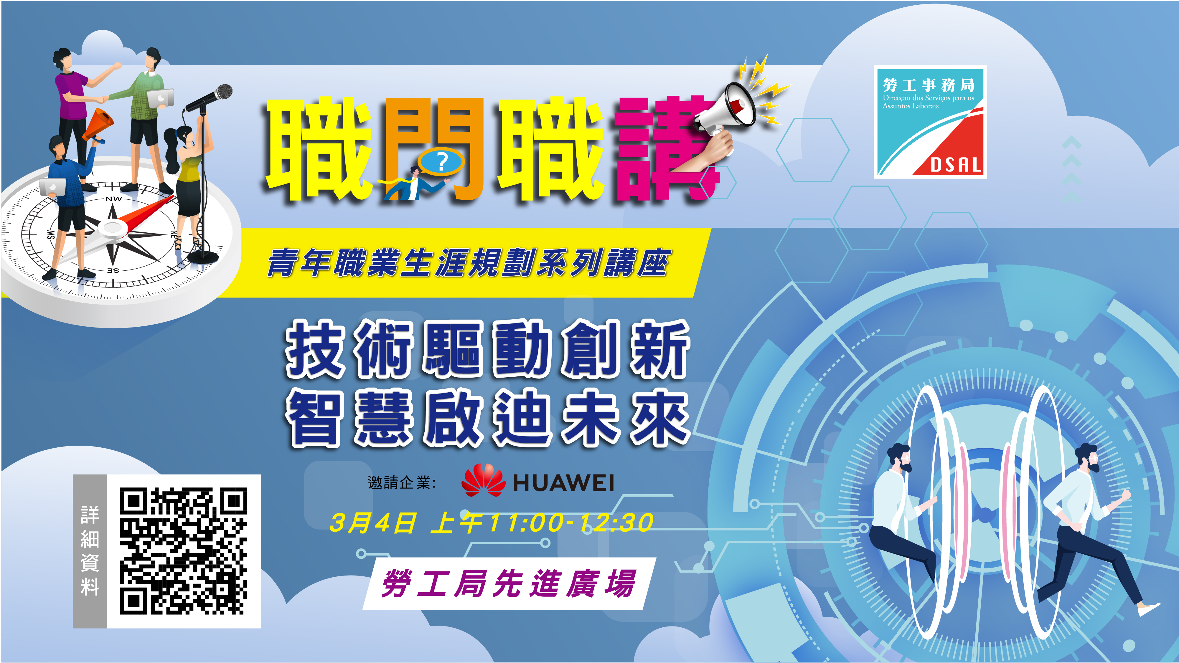 為配合特區政府“1+4”適度多元發展策略,優化產業結構培養產業人才,勞工事務局與華為服務(香港)有限公司-澳門分公司合作將於3月推出見習計劃。為讓澳門青年認識和了解高新技術產業及崗位資訊,勞工局邀請華為代表主講“職問職講”行業講座。