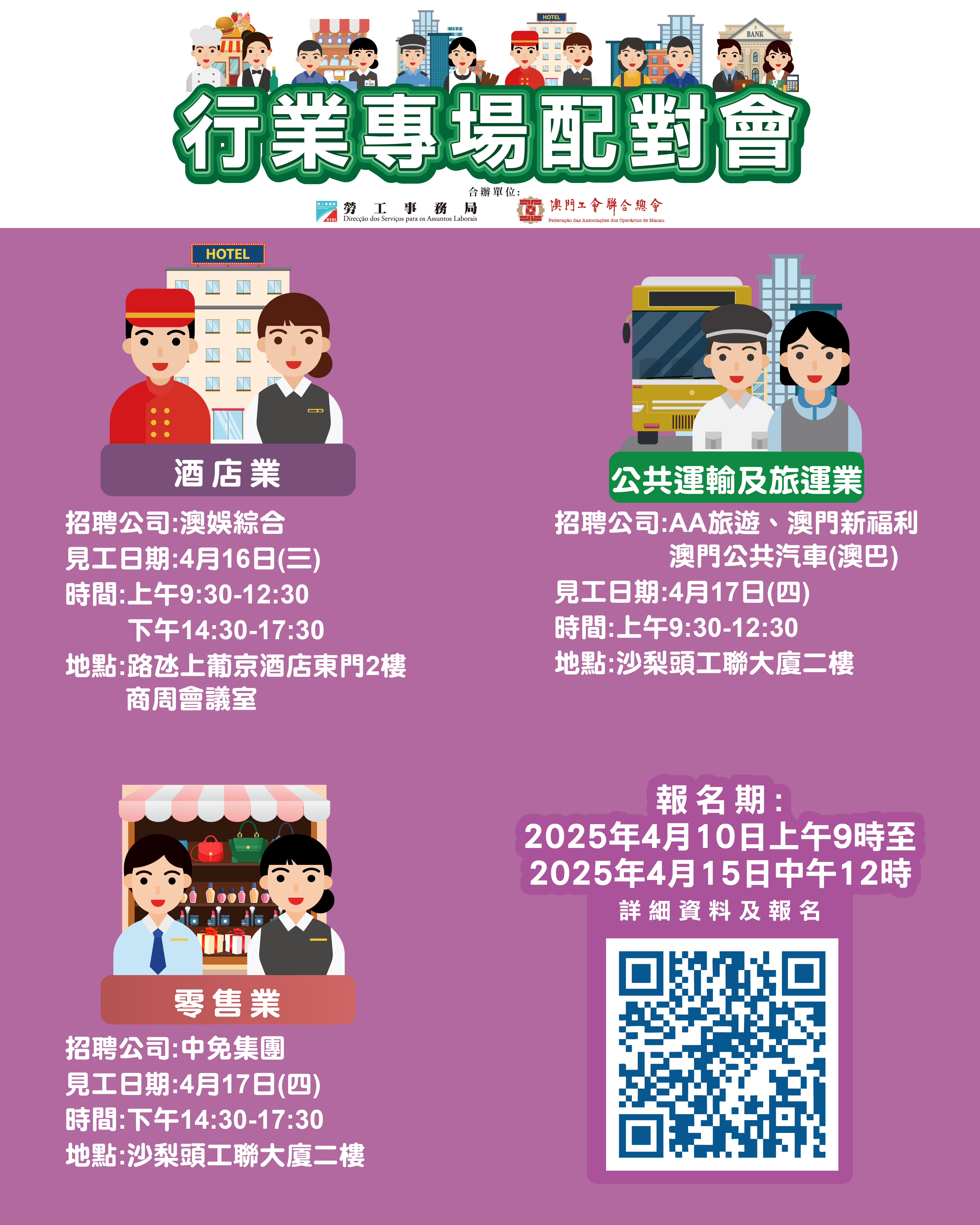 為協助有求職需求的澳門居民盡快就業,以及為緩解業界的人資需求壓力,勞工事務局(下稱“勞工局”)與澳門工會聯合總會(下稱“工聯”)合作於4月第三周舉辦3場行業專場配對會,合共提供79個空缺,報名日期為4月10日上午9時至4月15日中午12時。