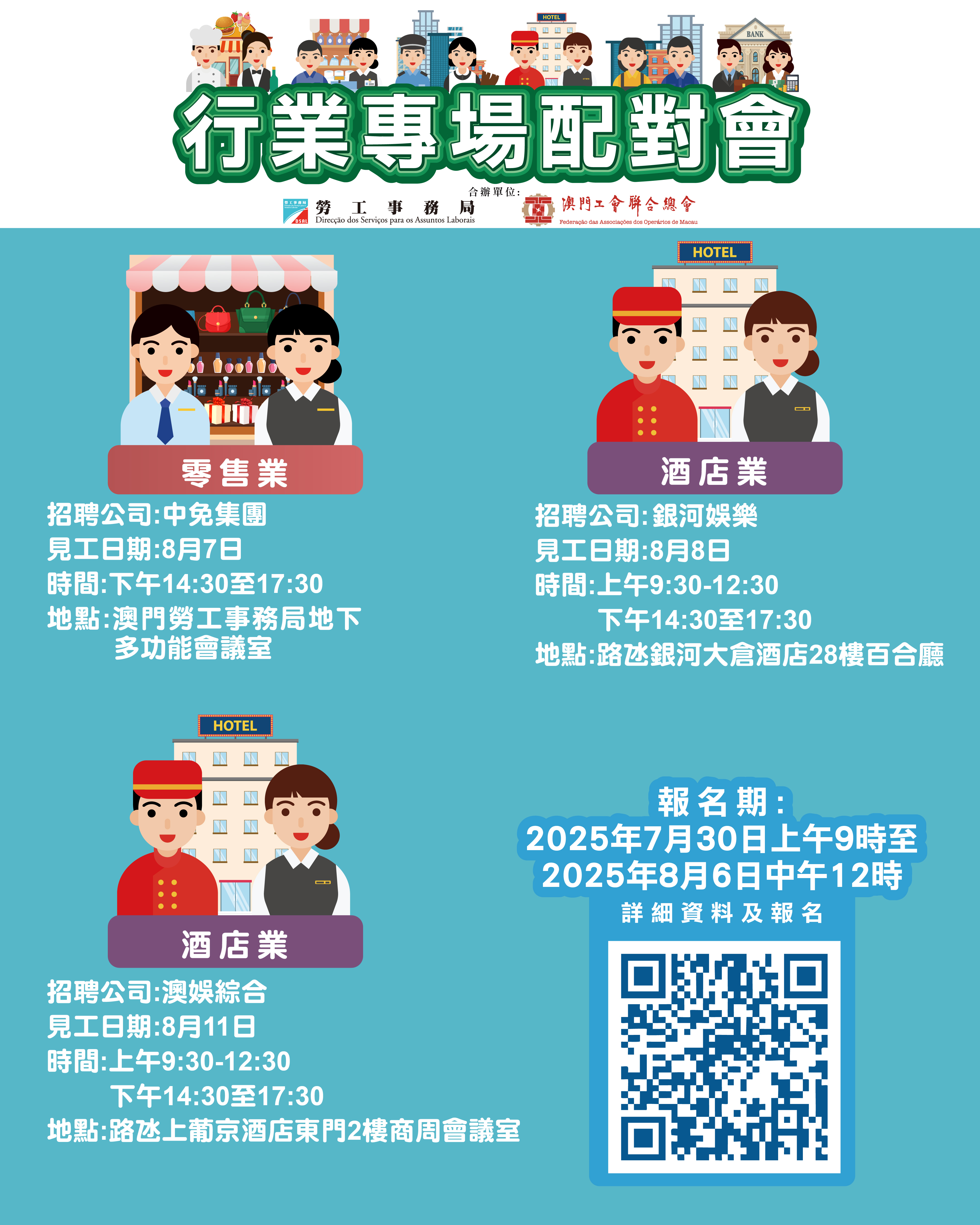 8月7日下午舉辦「中免集團澳門一人有限公司」專場配對會,提供30個職位空缺,涉及銷售員。