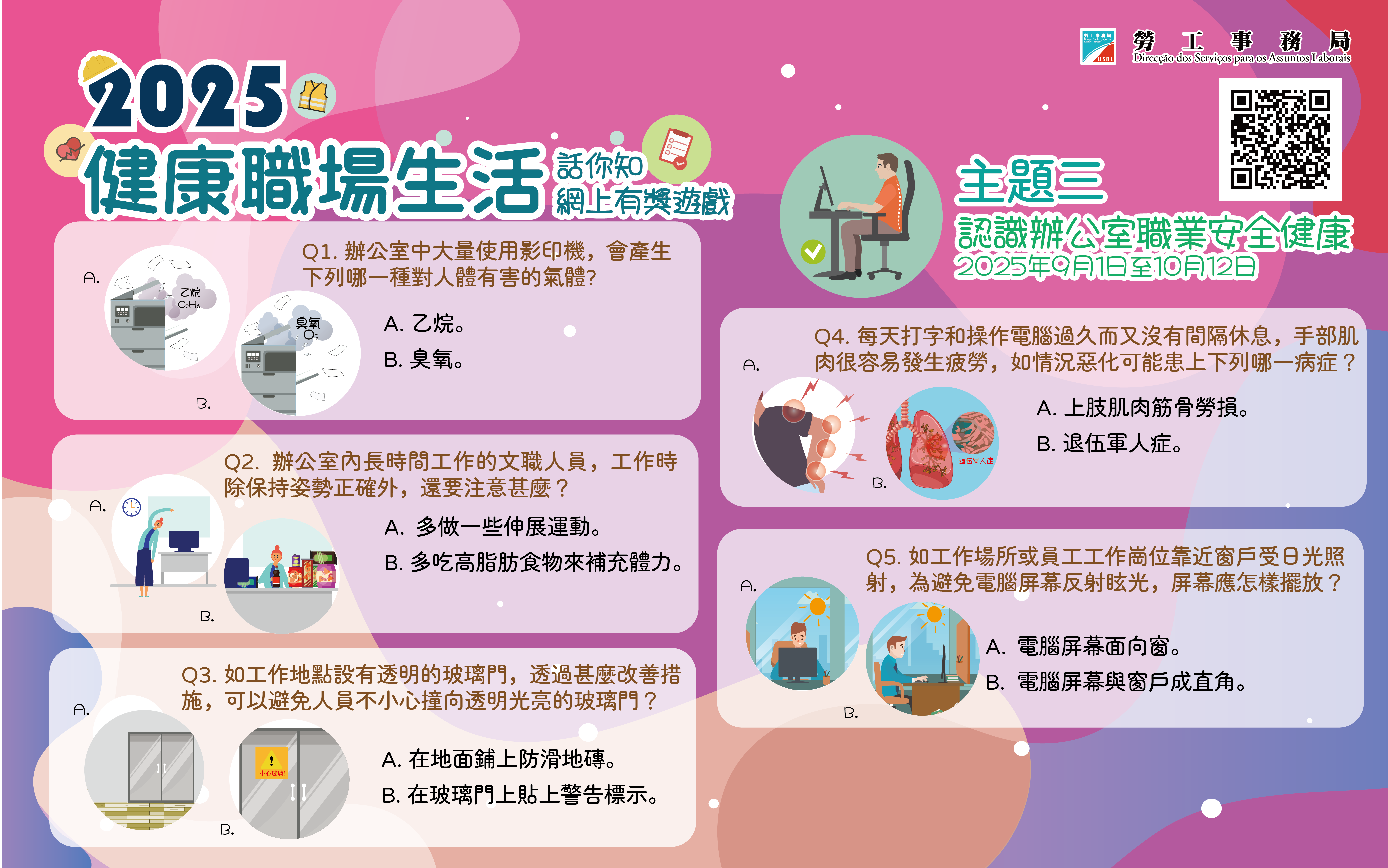 為持續提升市民對職業健康的關注,勞工局由9月1日起至10月12日期間推出第三期職業健康有奬遊戲,主題為“認識辦公室職業安全健康”。歡迎有興趣的市民可透過勞工事務局手機應用程式或掃描二維碼參與。
