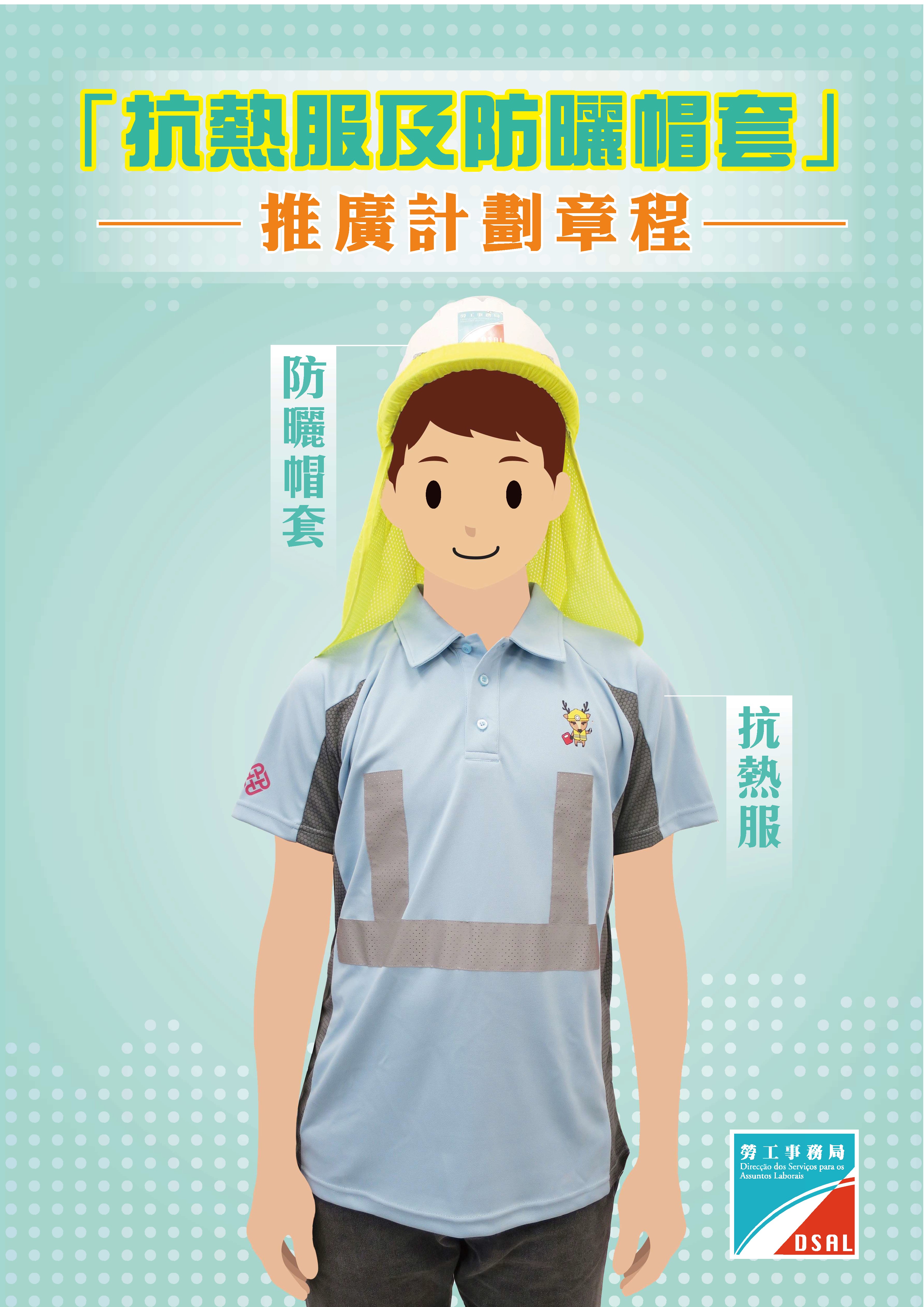 勞工局正推出「抗熱服及防曬帽套」及「便攜式掛腰風扇」推廣計劃,以及備有《熱帶氣旋、暴雨及特殊天氣等情況下的工作安全指引》及預防中暑的海報,歡迎巿民瀏覽和索取。如欲獲取更多職安健資訊,歡迎瀏覽勞工局職安健天地網頁www.dsal.gov.mo,亦可致電28717781或電郵dsaldsso@dsal.gov.mo查詢。