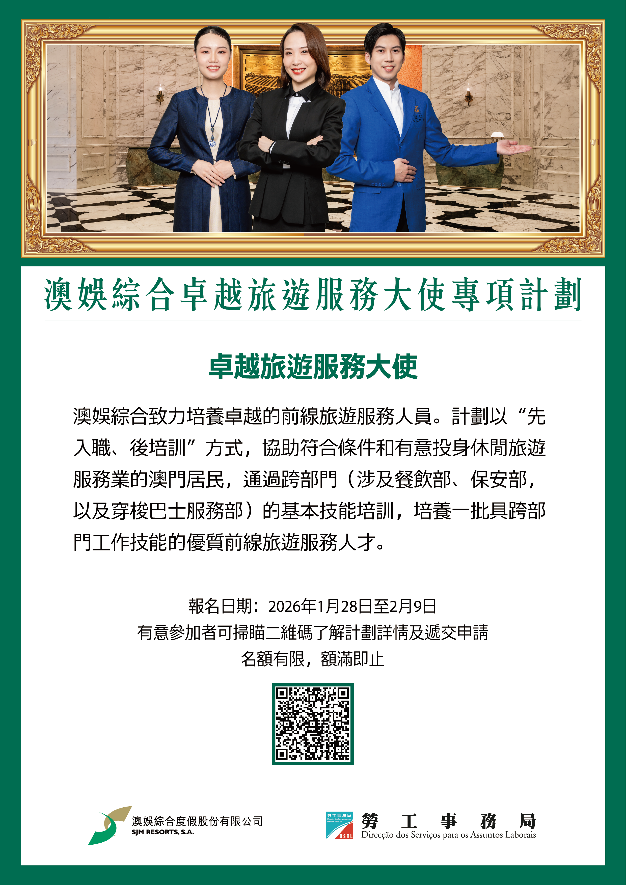 為應對澳門旅遊業發展需要,以及節假日期間有大量的旅客接待工作,勞工事務局(下稱“勞工局")和澳娛綜合度假股份有限公司(下稱“澳娛綜合”)合作推出“澳娛綜合卓越旅遊服務大使專項計劃”(下稱“計劃”),以“先入職、後培訓方式”,培養一批具跨部門工作技能的前線旅遊服務人員。明(28日)起接受申請。
