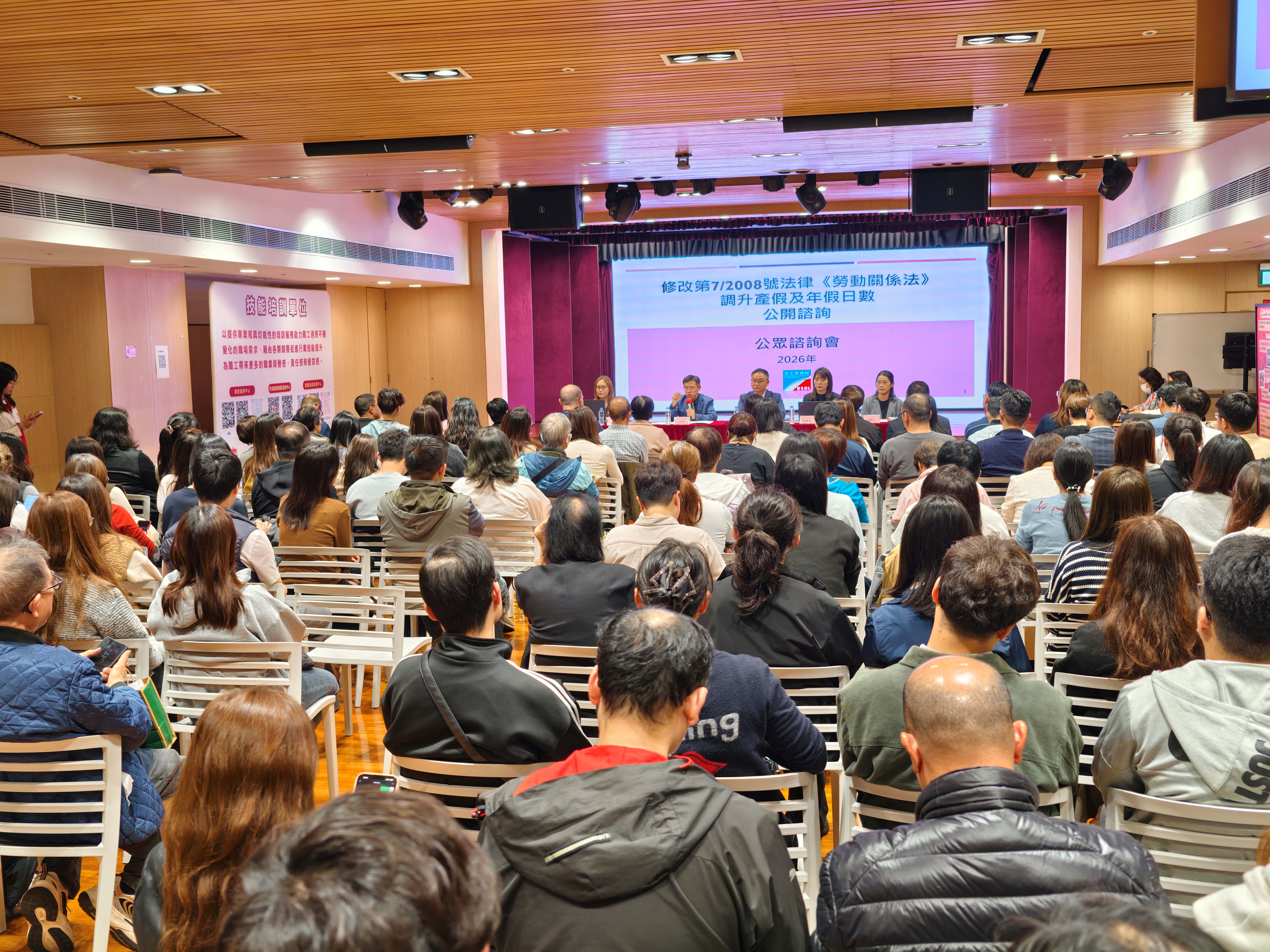 勞工事務局(下稱“勞工局”)正就修改第7/2008號法律《勞動關係法》關於調升產假及年假日數進行為期45日的公開諮詢,已於2月8日舉辦首場公眾諮詢會,並分別於2月4日及11日舉行了兩場面向僱員團體和僱主團體的專場諮詢會,廣泛聽取並收集社會各界的意見和建議。